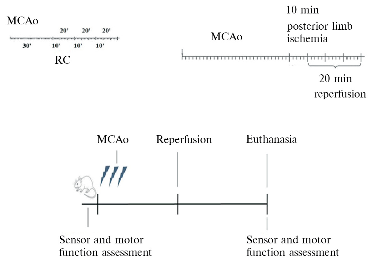 Эксперименты были проведены на крысах-самцах Вистар (n = 87) массой 250 ± 50 г из Биоколлекции Института физиологии им. И.П. Павлова РАН. Животные содержались в стандартных условиях вивария при свободном доступе к воде и пище. Модель ишемического инсульта выполняли по стандартной методике [4]. МCАо проводили с помощью внутрисосудистой монофиламентной нити под общей анестезией (золетил 100 VIRBAC, Франция) и ксилазин (Xyla, Xylazine 2%, Interchemiewerken «De Adelaar B. V.», Нидерланды)). Смесь вводили внутримышечно в дозе 0.88 мл/кг. Ишемия в течение 30 мин вызывала нарушение кровообращения в бассейне левой средней мозговой артерии. Величина инфаркта мозга являлась достаточной для оценки повреждения [5]. Всем животным выполняли ультразвуковую допплеровскую флоуметрию для оценки линейной скорости кровотока (Vas (mm/sec) в капиллярах кожи левой задней конечности (Минимакс, Россия)). В нашем эксперименте использовали протокол дистантного кондиционирования (RC). Схема эксперимента приведена на рис. 1.