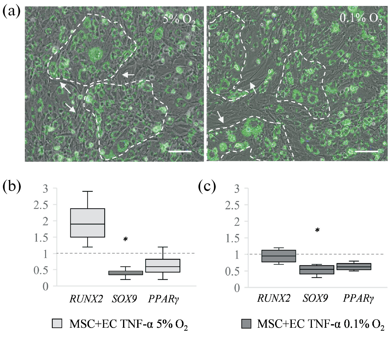 Рис. 4. Морфология и транскрипционный профиль МСК после взаимодействия с ЭК активированными ФНО-α. (a) – вид сокультуры через 24 ч при 5 и 0.1% О2. Представлены репрезентативные изображения, полученные путем совмещения микрофотографий, сделанных в режиме фазового контраста и флуоресценции, эндотелиальные клетки окрашены флуоресцентным красителем PKH27. Масштабный отрезок равен 100 мкм. Стрелками указаны МСК; (b), (c) – экспрессия дифференцировочных генов МСК после взаимодействия с ЭК, активированными при пониженном содержании О2. На графиках показана кратность изменения экспрессии генов в МСК после сокультивирования по сравнению с монокультурой МСК (пунктирная линия) в тех же условиях. Данные представлены как медиана, межквартильный разброс, максимальные и минимальные значения, n ≥ 3. * – p < 0.05 по сравнению с монокультурой МСК, культивируемых при 5% О2. MSC+EC TNF-α – МСК после 24 ч сокультивирования с активированными ФНО-α ЭК.