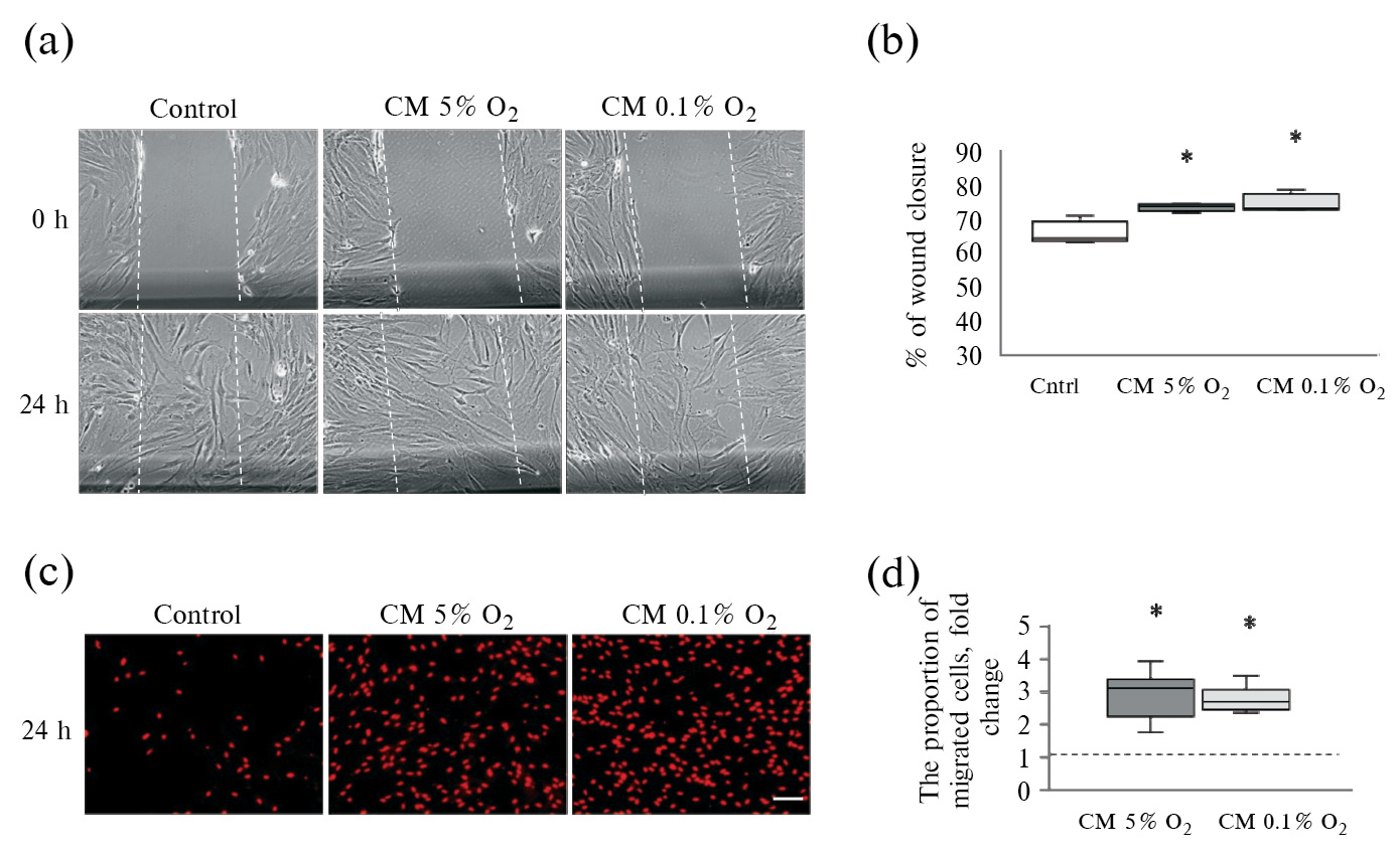 МСК способны мигрировать в ткани благодаря способности отвечать на хемотактические стимулы, продуцируемые находящимися там клетками. Для оценки влияния активированных ЭК на подвижность МСК мы проанализировали эффективность ненаправленной (в модели рана) и направленной (в системе трансвелл) миграции клеток в кондиционированной среде. При различном содержании кислорода (5 и 0.1% О2) среда, полученная от активированных ЭК, по сравнению с обычной средой культивирования увеличивала процент закрытия площади экспериментальной «раны» (рис. 7a, b). Кроме того, количество клеток, мигрировавших через трансвелл в кондиционированной среде, в 2.5–3 раза превышало количество МСК, которые мигрировали в ростовой среде (рис. 7c, d). Таким образом, кондиционированная среда, полученная после культивирования активированных ЭК при гипоксии разной степени выраженности, увеличивала скорость направленной и ненаправленной миграции МСК.
