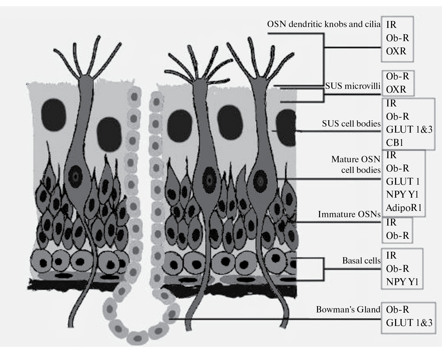 Рис. 2. Схематическое изображение распределения рецепторов к основным метаболическим факторам в обонятельной слизистой. OSN – обонятельный сенсорный нейрон, IR – киназа инсулинового рецептора, Ob-R – лептиновый рецептор, OXR – орексиновый рецептор, GLUT – переносчик глюкозы, CB1 – каннабиноидный рецептор 1-го типа, SUS – опорные клетки, NPY Y1 – рецептор Y1 для нейропептида Y, AdipoR 1 – адипонектиновый рецептор 1-го типа.