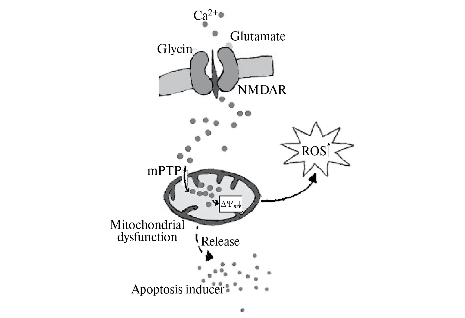 Рис. 4. Схема механизма эксайтотоксичности NMDAR в ОСН. Повышенный уровень глутамата, возникающий при патологии, вызывает чрезмерную активацию ионотропного NMDAR, проявляющуюся в запуске значительного притока внеклеточного Са2+ в ОСН. Вследствие этого в цитозоле и митохондриях возникает перегрузка кальцием. Избыточное содержание Са2+ влечет за собой дисфункцию митохондрий, сопровождающуюся деполяризацией митохондриального мембранного потенциала (ΔΨm), снижением выработки АТФ, накоплением активных форм кислорода (АФК) и высвобождением индуктора апоптоза цитохрома C. NMDAR – ионотропный рецептор глутамата, связывающий N-метил-D-аспартат; mPTP – пора, изменяющая проницаемость мембраны митохондрии, ΔΨm – митохондриальный мембранный потенциал; ROS – реактивные формы кислорода.