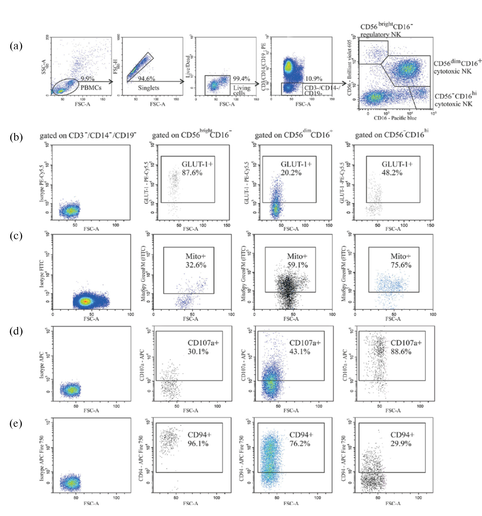 Рис. 1. Стратегия гейтирования, используемая для анализа разных субпопуляций NK-клеток периферической крови и экспрессии молекул Glut-1, CD94, CD107a, массы митохондрий