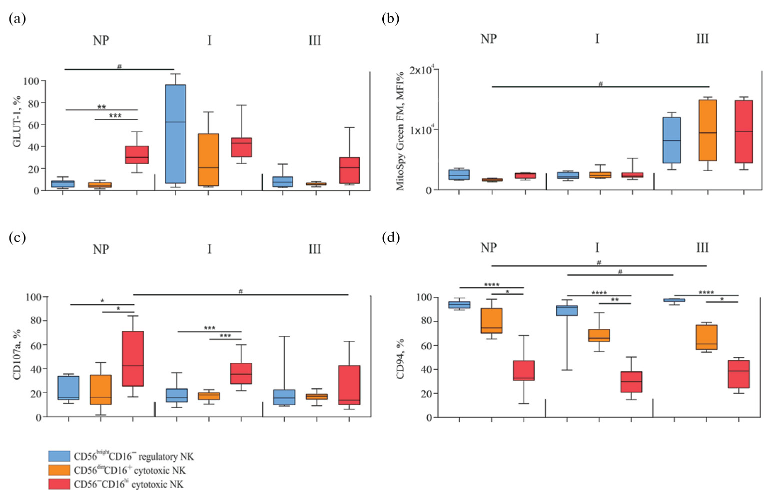 Отличия по экспрессии Glut-1a отражают разную способность к потреблению глюкозы и, как следствие, разную метаболическую активность. Так, у небеременных наиболее метаболически активными, по-видимому, являются CD16hiCD56–NK, которые обладают и наибольшей цитотоксичностью, судя по высокой экспрессии CD107a, CD16 и низкой экспрессии CD94. А регуляторные CD16–CD56brightNK и цитотоксические CD16+CD56dimNK сравнимы по показателям метаболической активности и интенсивности дегрануляции. Можно полагать, что реализация цитотоксической функции CD16hiCD56–NK требует повышенного потребления глюкозы. Хотя функции CD16hiCD56–NK до конца не изучены, полученные результаты делают их перспективным объектом для использования в иммунотерапии.