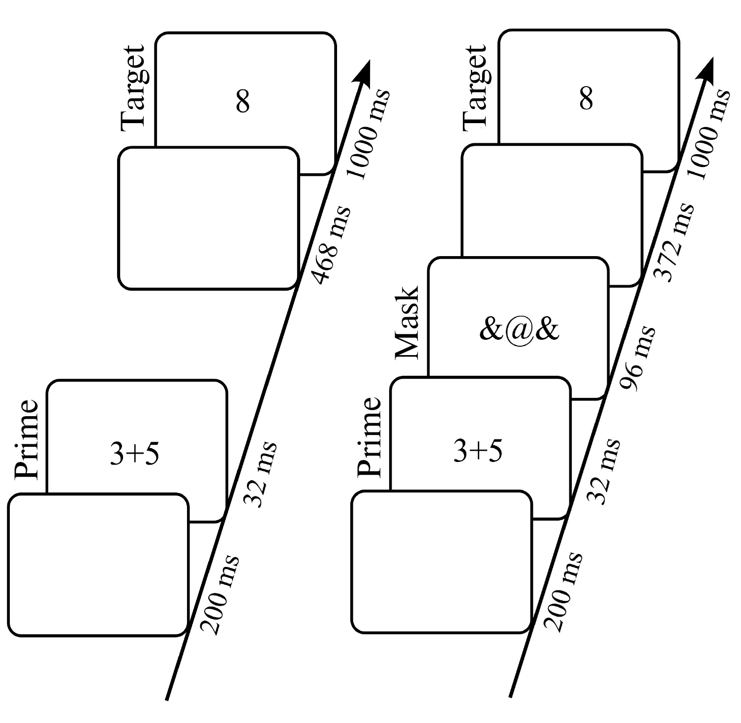 Поведенческие исследования с использованием замаскированного прайминга в арифметической задаче проверки ответа свидетельствуют о том, что человек способен неосознаваемо выполнять такие арифметические вычисления c однозначными целыми числами, как умножение, сложение и вычисление среднего [17–19]. Было установлено, что время реакции на предъявление целевых чисел уменьшается в случае предъявления перед ними замаскированного примера, результат вычисления которого совпадает по значению с целевым числом.