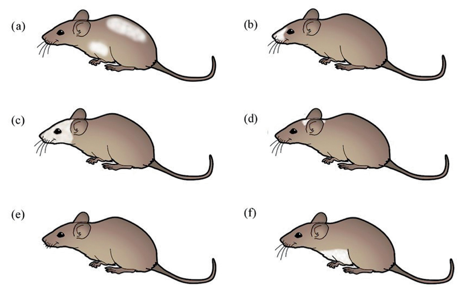 Рис. 1. Схематичное изображение типичных форм барберинга у лабораторных мышей (также см. табл. 1): (а) – барберинг на голове у мышей линии С57Bl/6, (b) – барберинг морды у мышей линии NMRI, (c) – сильный барберинг всей головы у мышей линии 129/SvJ, (d) – барберинг между ушами у мышей линии 129S1, (e) – обкусывание вибрисс у мышей линии A/J, (f) – материнский барберинг живота у мышей линии 129S1. Диаграмма приводит типичную локализацию барберинга, степень его выраженности может сильно варьировать среди особей одной линии.