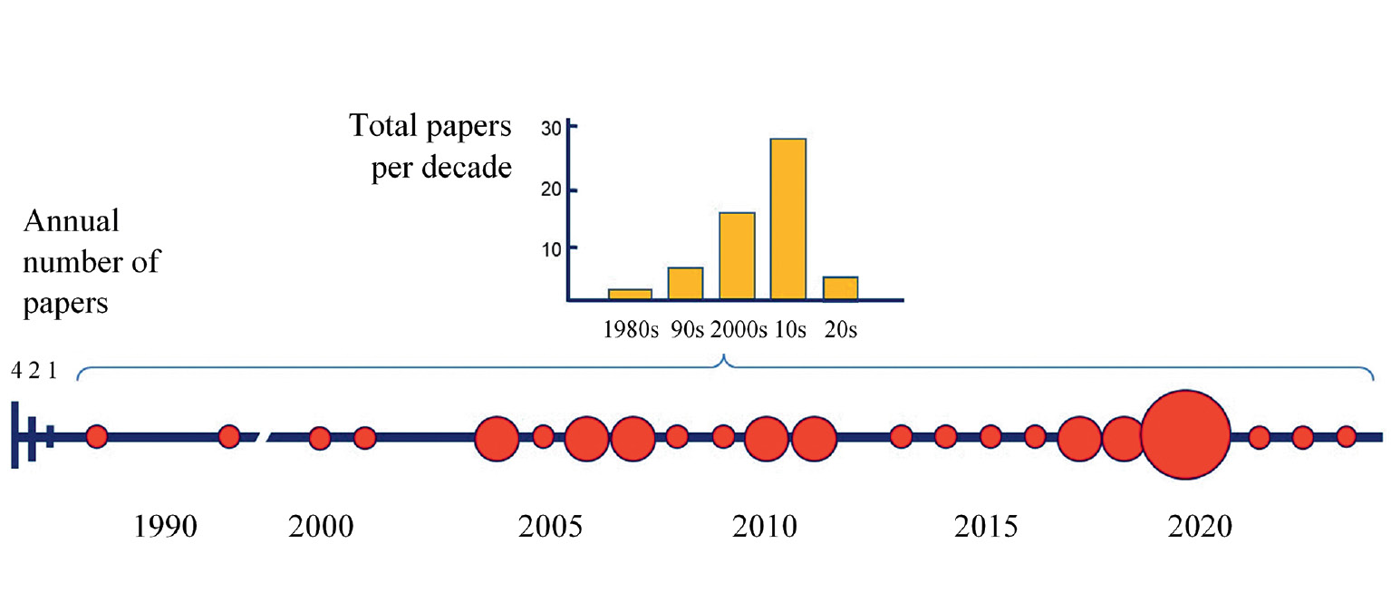 Рис. 2. Временная динамика исследовательских работ в области барберинга грызунов, представленных в базе данных Pubmed на март 2024 г. Радиус отражает количество работ за определённый год, включая обзорные и экспериментальные работы. Следует отметить, что пик публикаций по теме приходится на последние две декады, когда происходила стандартизация экспериментальных доклинических протоколов по лабораторным грызунам, и произошел всплеск генно-модифицированных животных, чьи поведенческие и физиологические характеристики подробно изучались.