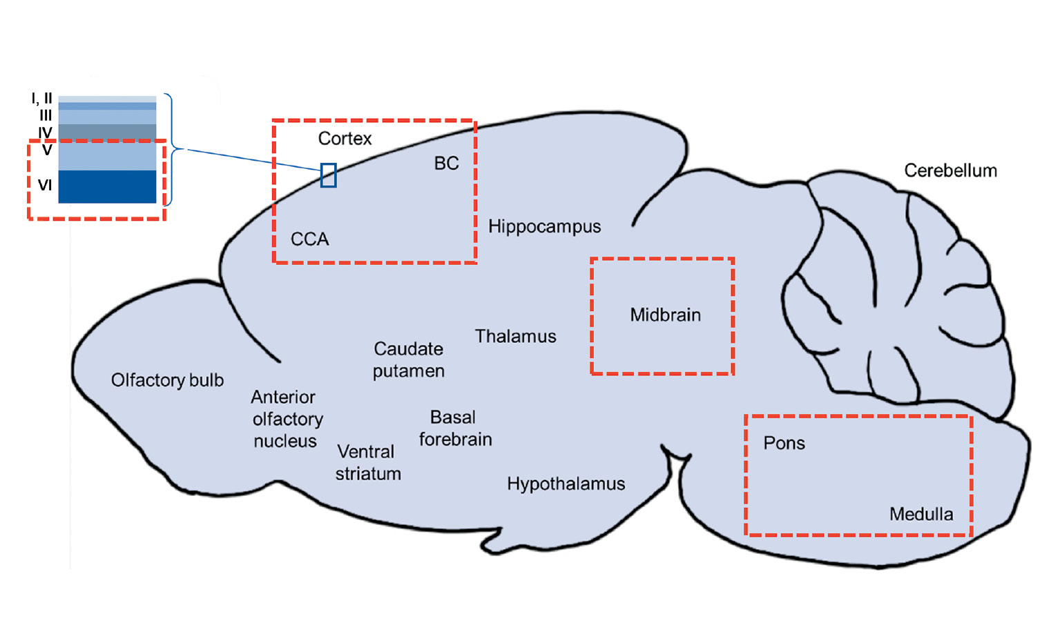 Рис. 4. Схема строения мозга мыши c помеченными пунктиром отделами, ассоциированными с барберингом (см. также табл. 3). Взаимосвязь барберинга со структурами головного мозга характерна для таких регионов, как бочкообразная кора (BC – barrel cortex) [4], V и VI слои коры [28], передняя поясная кора (CCA – cortex cingularis anterior) [31], средний и задний мозг [54, 17].
