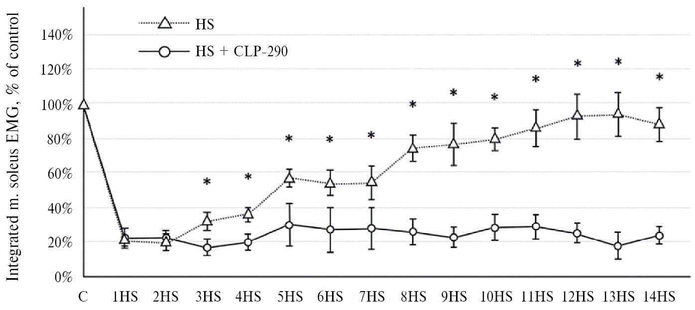Рис. 2. Типичные паттерны ЭМГ-активности камбаловидной мышцы перед антиортостатическим вывешиванием (С) и во время 14-дневного вывешивания (1–14HS) у крыс без введения и с введением CLP290.