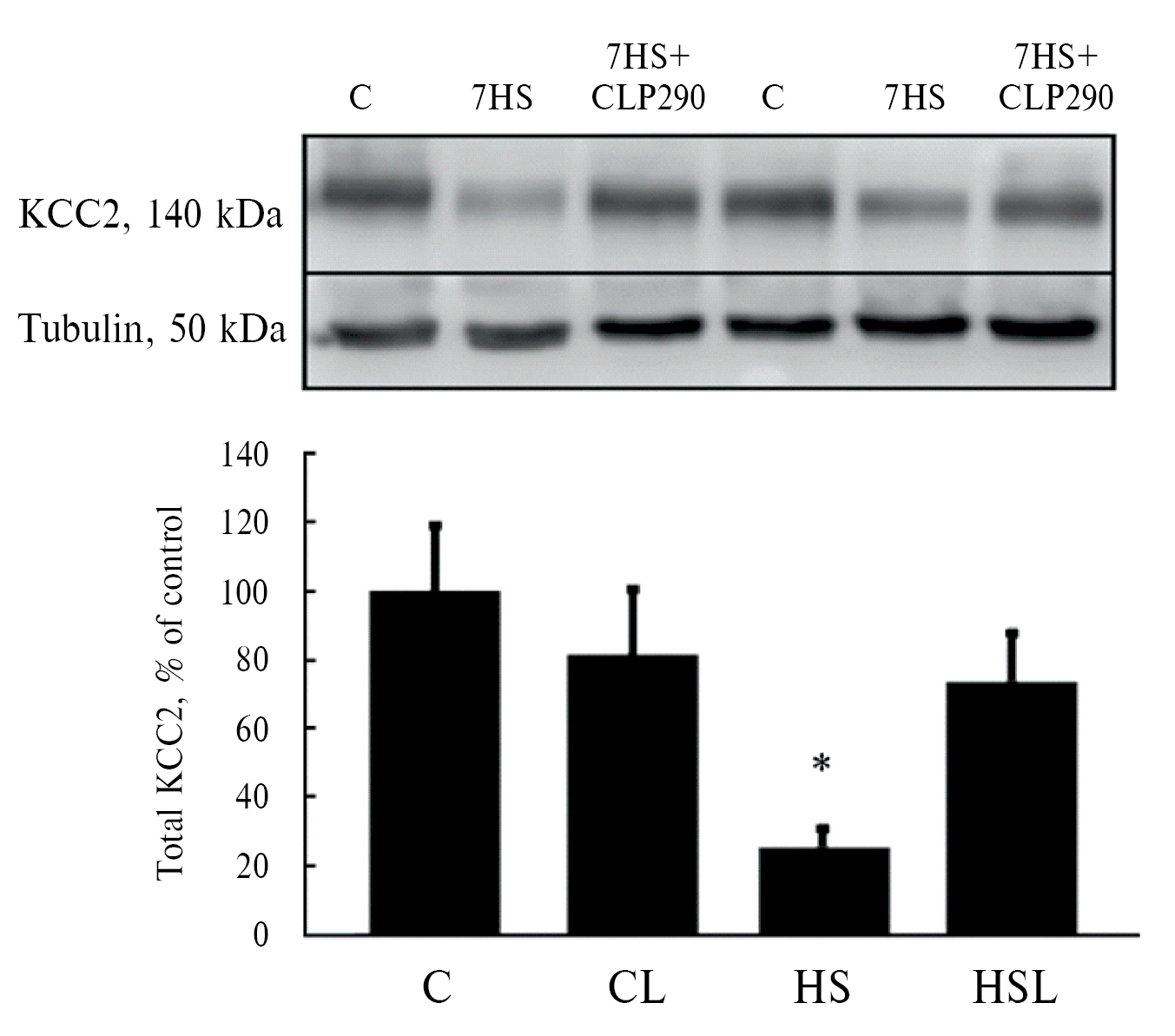Рис. 4. Содержание KCC2 в спинном мозге экспериментальных животных. C – контроль; CL – контроль + введение CLP290 в течение 7 суток; HS – вывешивание в течение 7 суток; HSL – вывешивание в течение 7 суток с ежедневным введением CLP290. Данные представлены как среднее ± σ. * – отличие от контроля (p < 0.05).