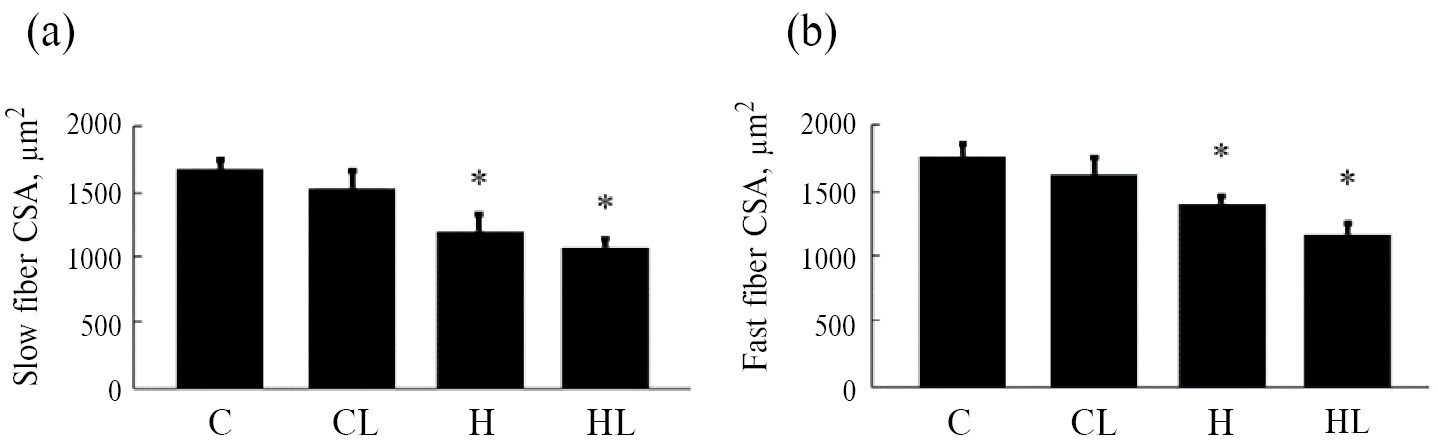 ППС «быстрых» и «медленных» мышечных волокон была статистически значимо снижена в группе чистого вывешивания «НS» в сравнении с группами «С» и «СL». В группе «HSL» ППС волокон обоих типов была также статистически значимо снижена в сравнении с группами «С» и «CL» (рис. 5). Между группами HS и HSL статистически значимых отличий по этим параметрам не было обнаружено.