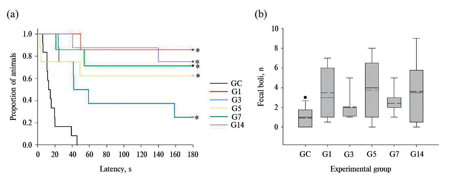 Графическое представление данных и их статистический анализ выполнены с использованием пакета программ SigmaPlot (версия 12.5, Systat Software Inc., США). Для сравнения ЛП наступления оцениваемой реакции (подныривания) использовали анализ выживаемости Каплана – Майера, позволяющий принимать во внимание цензурированные данные [35], то есть учитывать показатели животных, поведенческая реакция которых не происходила до окончания теста. Данные по количеству фекальных болюсов, оставленных животными в экспериментальной установке, проверяли на нормальность распределения (тест Шапиро – Уилка) и равенство дисперсий. Далее их ранжировали и выполняли однофакторный дисперсионный анализ (ANOVA). Различия считали значимыми при p < 0.05.