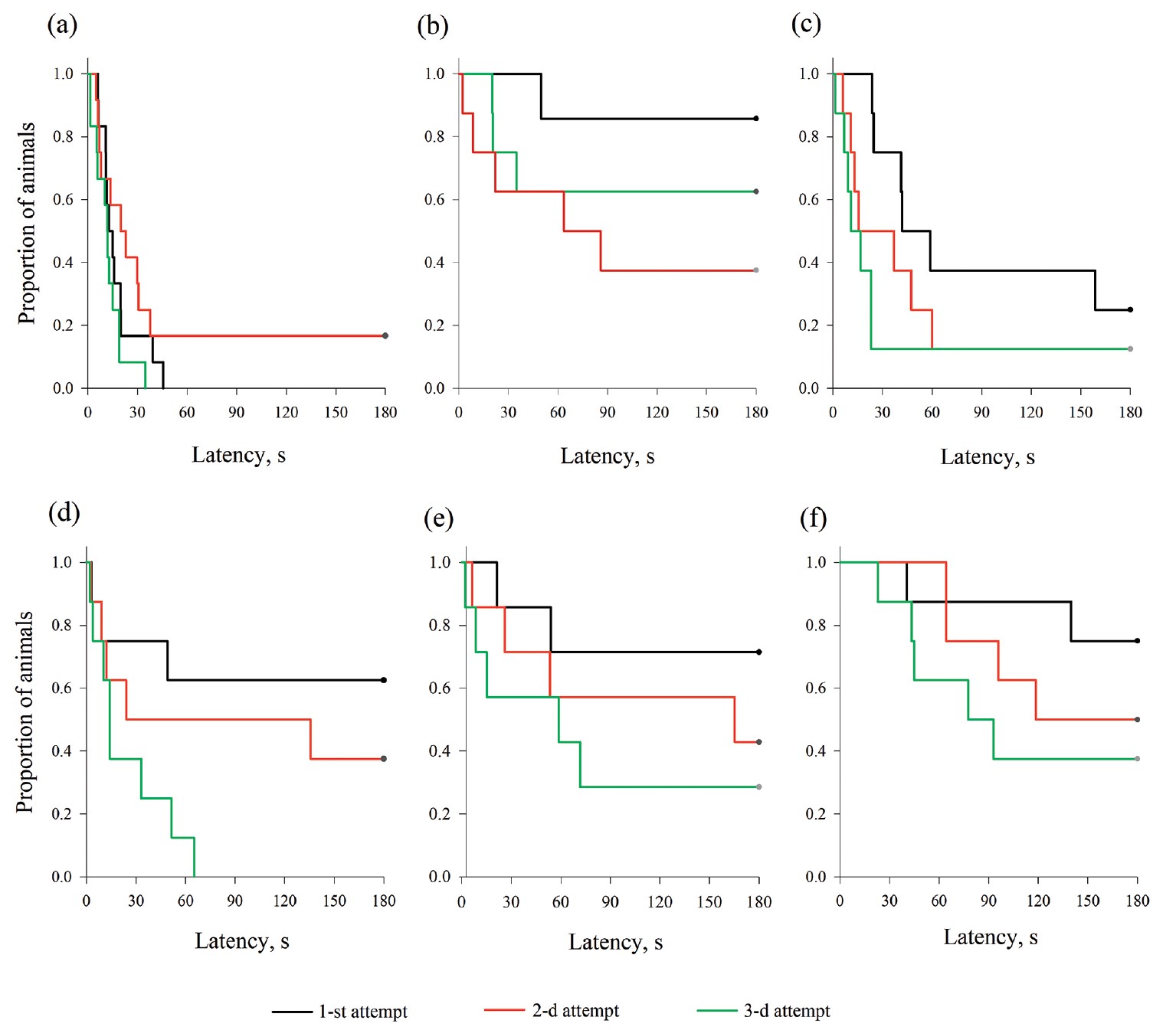 Рис. 3. Формирование навыка подныривания у интактных крыс (a) и имеющих опыт форсированного плавания: за 1 (b), 3 (c), 5 (d), 7 (e) и 14 (f) суток до выполнения теста. Распределение длительности латентных периодов подныривания представлено в виде кривых Каплана – Майера. Максимальная длительность теста – 3 мин. n = 7–12.