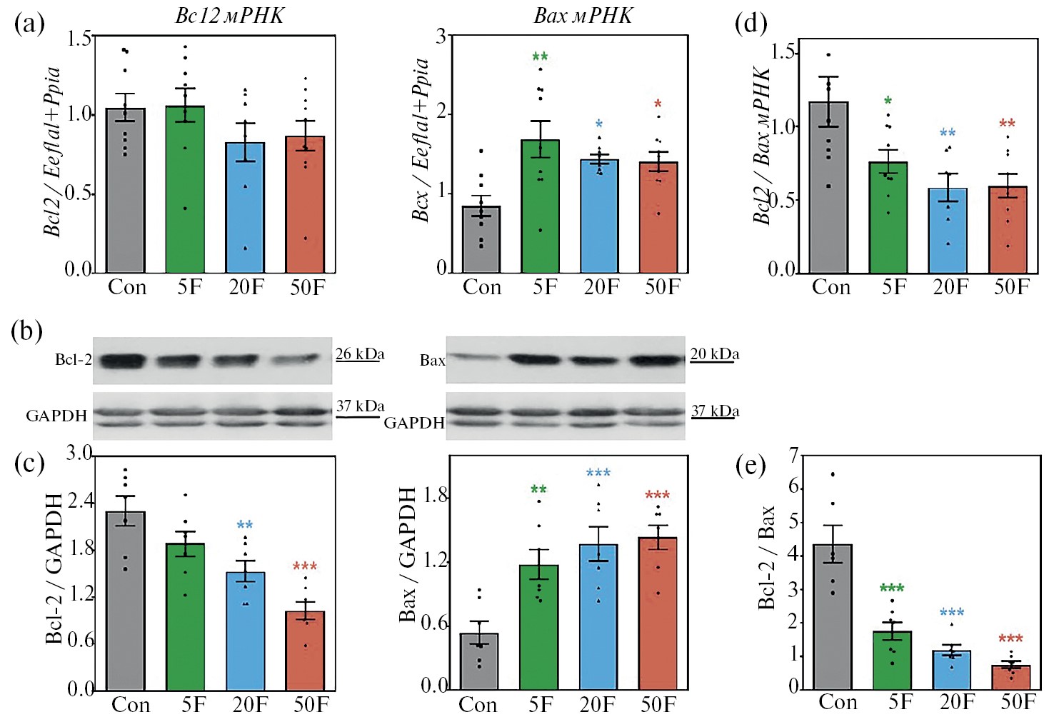Рис. 1. Изменения экспрессии антиапоптотического белка Bcl-2 и проапоптотического белка Bax в гиппокампе крыс после воздействия F- на уровне транскрипции и трансляции. (a) – Уровни экспрессии генов Bcl2 и Bax в клетках гиппокампа, нормализованные по отношению к экспрессии пары референсных генов Eef1a1+Ppia (средние значения ± SE, n = 7–9). (b) – Репрезентативные иммуноблоты для одной крысы из каждой группы. (c) – Среднее содержание белков Bcl-2 и Bax ± SE в клетках гиппокампа, рассчитанное по отношению к оптической плотности референсного белка GAPDH (n = 7). (d) – Отношение экспрессии генов Bcl-2 и Bax. (e) – Соотношение уровней белка Bcl-2 и Bax. * p < 0.05, ** p < 0.01, *** p < 0.001 по сравнению с контрольной группой (Con).