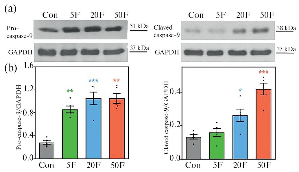 Средний уровень нативной формы каспазы-9 с молекулярной массой 51 kDa был низким в цитоплазме клеток гиппокампа контрольных животных, однако он повышался в гиппокампе крыс из всех групп, получавших избыток фтора (рис. 2a, b). Кроме того, в гиппокампе животных, получавших 20 и 50 мг/л F-, наблюдалось увеличение содержания зрелой формы каспазы-9 с молекулярной массой 38 kDa (рис. 2a, b). Такие процессы приводят к изменению соотношения уровней экспрессии прокаспазы-9, не обладающей протеолитической активностью, и активной каспазы-9, принимающей участие в реализации программы апоптоза.