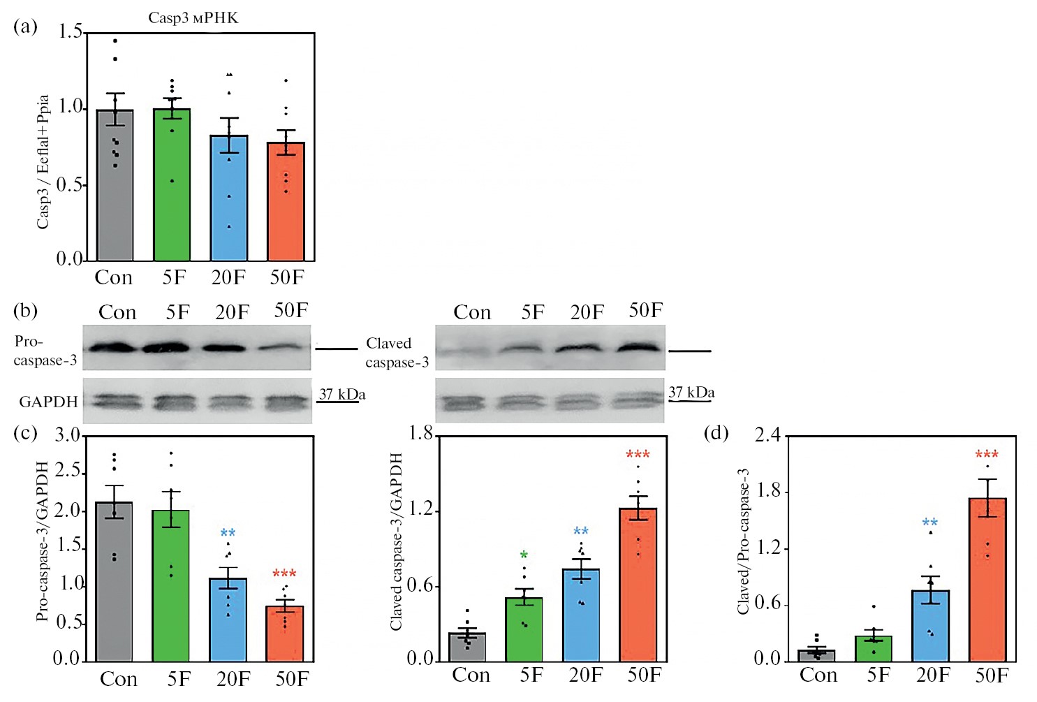 Рис. 3. Стимуляция каспазы-3 в гиппокампе крыс, потреблявших избыток F-. (a) – Уровни Casp3 мРНК в клетках гиппокампа крыс всех экспериментальных групп (средние значения ± SE, n = 8–10). (b) – Типичные примеры иммуноблотов нативной формы каспазы-3 и активной каспазы-3 для одной крысы из каждой экспериментальной группы. (c) – Среднее содержание ± SE двух форм каспазы-3, нормализованное по GAPDH. (d) – Изменения соотношения уровней прокаспазы-3 и активной каспазы-3 (n = 6). * p < 0.05, ** p < 0.01, *** p < 0.001 по сравнению с контролем.