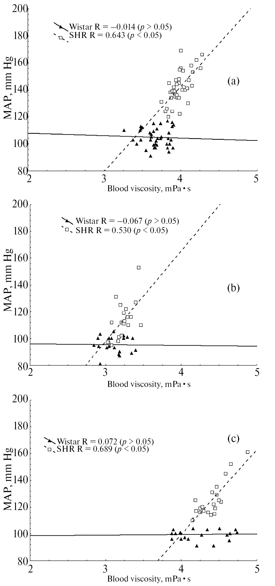 2. Fig. 1. Correlation between blood viscosity (450 s-1) and MAP in Wistar rats and SHR rats. (a) – initial values, (b) – after hemodilution, (c) – after hemoconcentration.