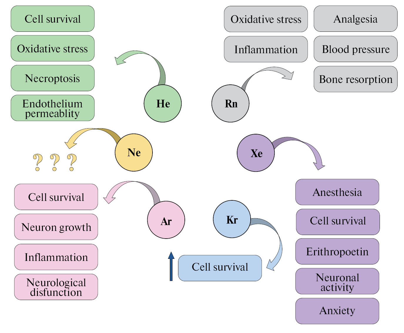 Однако несмотря на растущее количество исследований, посвященных данной проблеме, до сих пор наблюдается существенный разрыв между знаниями о физиологических эффектах инертных газов и механизмах их действия. Так, имеется множество данных о влиянии радона, ксенона, аргона и гелия на метаболические каскады, обуславливающие выживание клеток в различных тканях, но при этом только для ксенона описаны молекулярные мишени, инициирующие запуск физиологических изменений. Помимо этого, наблюдается явный дефицит исследований интегративных (поведенческих, нейроиммуноэндокринных) эффектов инертных газов. Неон и криптон, в свою очередь, представляют собой практически абсолютно неизведанную область в физиологии и фармакологии.