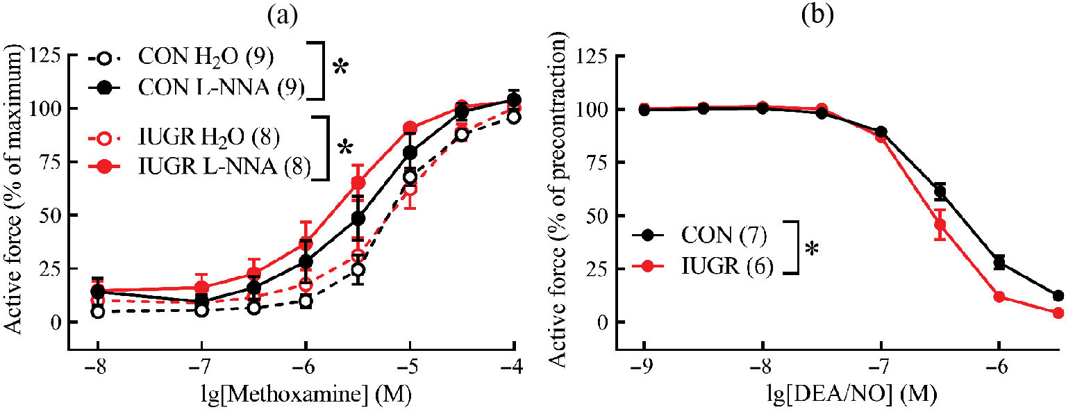 Рис. 2. Задержка внутриутробного развития (ЗВУР) не приводит к изменению антиконстрикторного вклада NO в подкожной артерии потомства в возрасте 11–12-дней. (a) – Вторые зависимости «концентрация – эффект» на метоксамин подкожной артерии крысят групп «Контроль» (CON) и «ЗВУР» (IUGR), полученные в присутствии ингибитора NO-синтаз L-NNA (100 мкМ) или эквивалентного объема растворителя (H2O, 50 мкл). (b) – Зависимости «концентрация – эффект» на донор NO DEA/NO подкожной артерии крысят групп «Контроль» (CON) и «ЗВУР» (IUGR) в присутствии ингибитора NO-синтаз L-NNA (100 мкМ). Цифры в скобках обозначают количество животных. * p < 0.05 (двухфакторный дисперсионный анализ для повторных измерений).