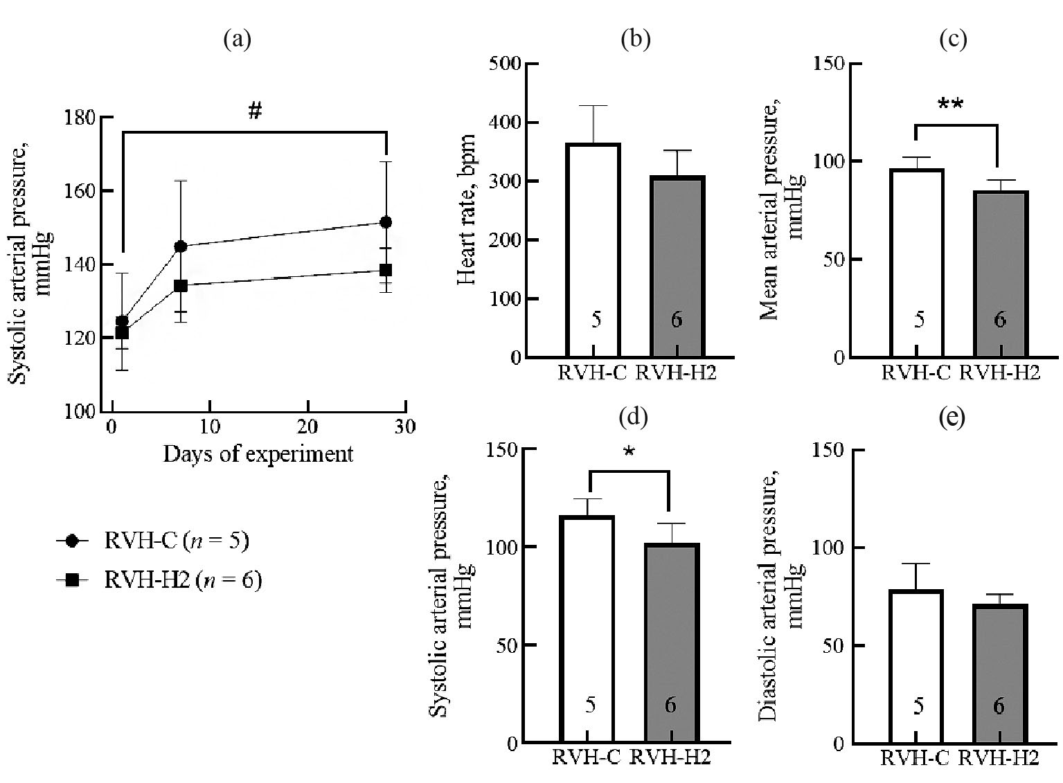 Исследования на наркотизированных животных показали статистически значимое уменьшение (p < 0.01) ср. АД (рис. 5c) в группе РВГ-Н2 (85.6 ± 5.2 мм рт. ст., n = 6) по сравнению с группой РВГ-К (96.5 ± 5.7 мм рт. ст., n = 5). Уменьшение ср. АД, так же как и в случае МКТ-ЛГ, было снижено за счет САД (рис. 5d), которое у животных из группы РВГ-Н2 (102.2 ± 9.9 мм рт. ст.) было статистически значимо (p < 0.05) меньше по сравнению с группой РВГ-К (116.2 ± 8.7 мм рт. ст.). ДАД (рис. 5e) и ЧСС (рис. 5b) достоверно не изменялись, хотя последний показатель имел тенденцию к уменьшению. Таким образом, и в случае РВГ 1П1К гипертонии при добавлении Н2 к атмосферному воздуху наблюдается уменьшение ср. АД за счет САД.