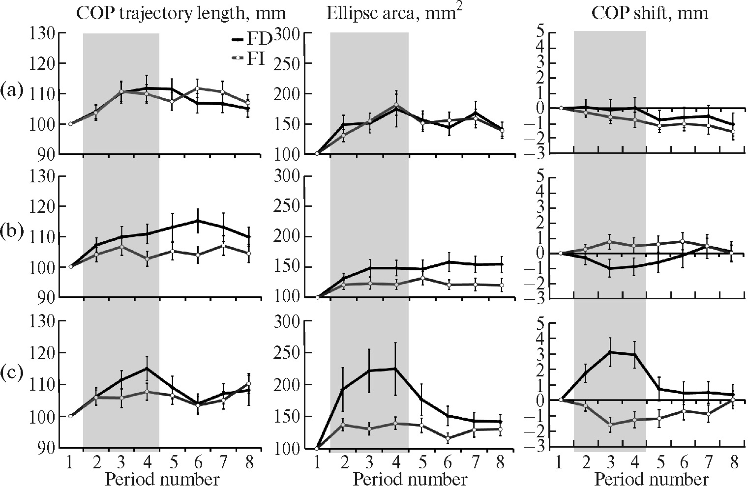 Рис. 3. Динамика стабилографических показателей в ответ на конспецифическое движение – звуки шагов человека в группах полезависимых (FD) и поленезависимых (FI) испытуемых.