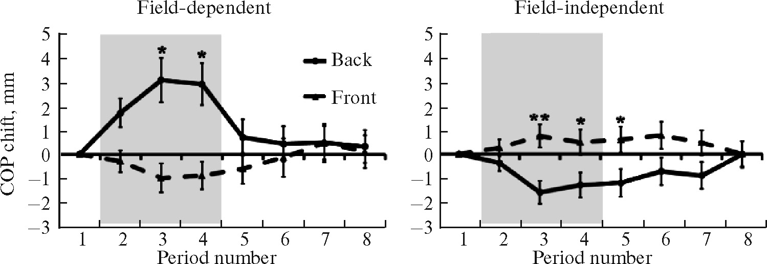 В ответ на звуки приближающихся шагов испытуемые с разным перцептивно-когнитивным стилем смещались в противоположных направлениях. ПЗ испытуемые отклонялись назад в ответ на шаги спереди, ПН испытуемые, наоборот, смещали ЦД вперед. Средние по группе изменения положения ЦД при сравнении последовательных периодов были недостоверными. Различия показателя смещения были выявлены только в виде тенденции между 1-м и 4-м периодами (p = 0.08) в одной из групп – у ПЗ испытуемых. При приближающихся шагах сзади ПЗ и ПН испытуемые также смещались в противоположных направлениях. ПЗ испытуемые смещались в среднем по группе на 3 мм вперед от положения, которое они занимали перед началом стимуляции. Достоверные изменения выявлены между 1-м и 3–4-м периодами (p < 0.05), а также 1-м и 2-м периодами в виде тенденции (p = 0.06). Испытуемые группы ПН отклонялись назад до 1.6 мм, достоверные изменения были между 1-м и 3–5-м периодами (p < 0.01, p < 0.05 и p < 0.05 соответственно).