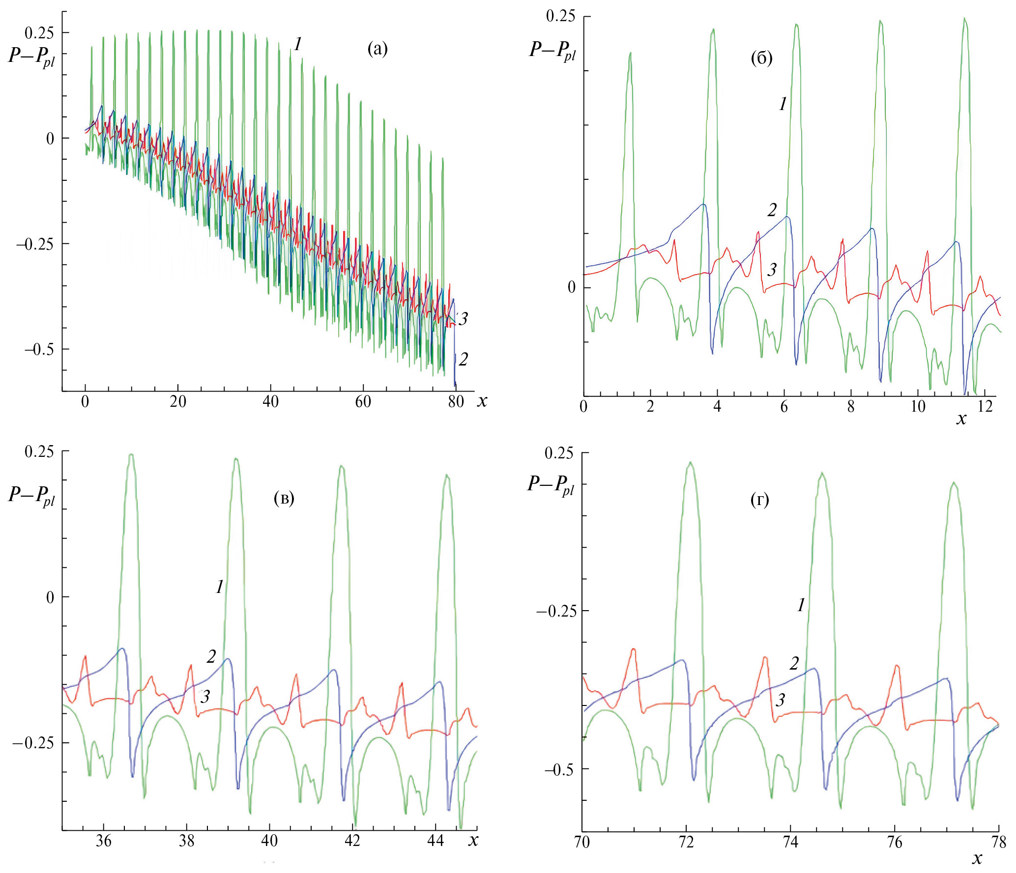 Рис. 3. Сравнение распределений перепада статического давления P–Ppl(x) в трех продольных сечениях канала (а) с 31 канавками и в укрупненных фрагментах во входном (б), среднем (в) и выходном (г) участках: z на кривых 1–3 – то же, что на рис. 2.