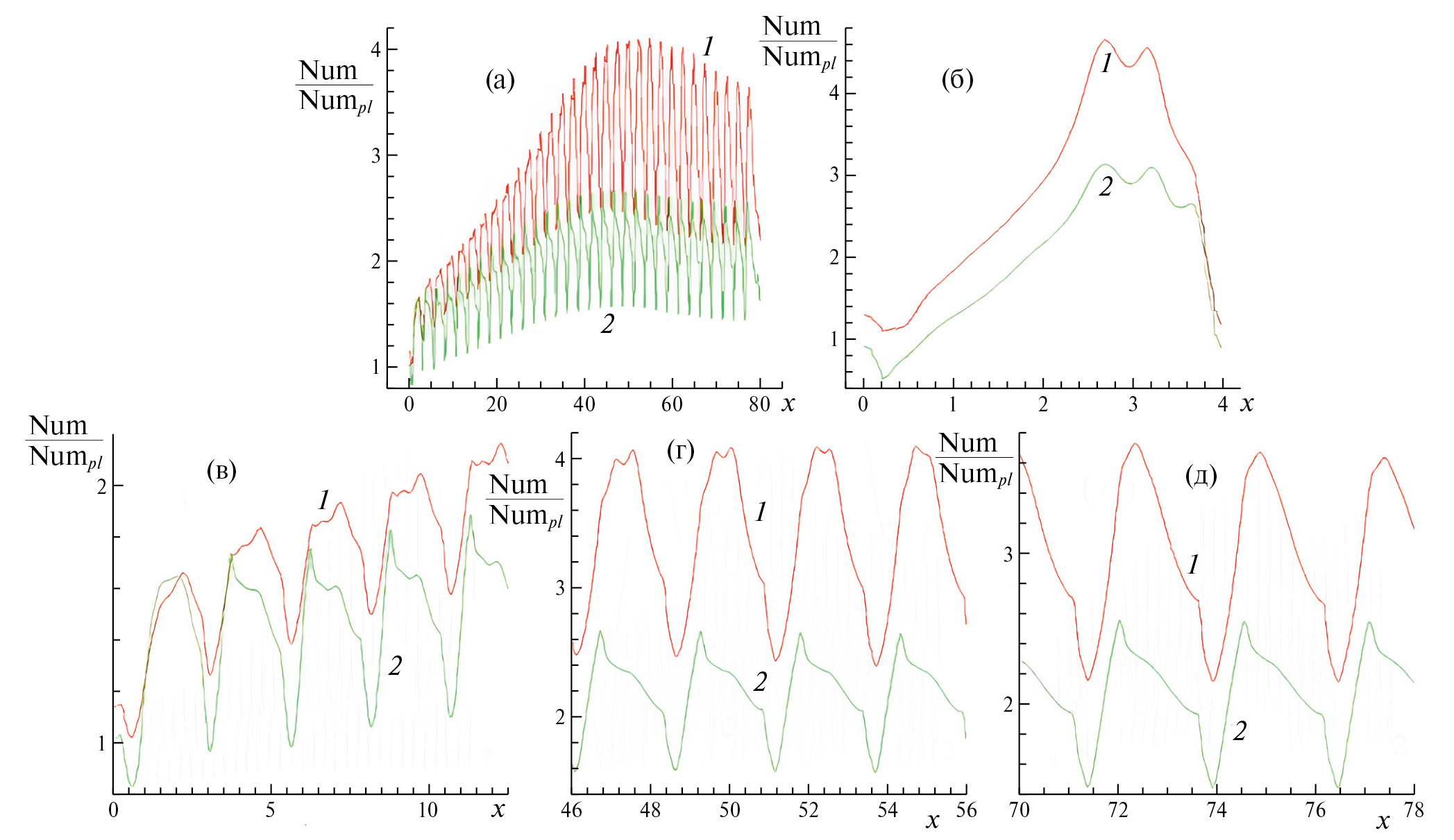 Рис. 4. Сравнение проинтегрированных по поперечным (а, в–д) и продольным (б) полосам распределений Num/Numpl на нагретой стенке канала при граничных условиях q = const (1) и T = const (2). Укрупненные фрагменты Num/Numpl(х) соответствуют входному (в), среднему (г) и выходному (д) участкам канала.