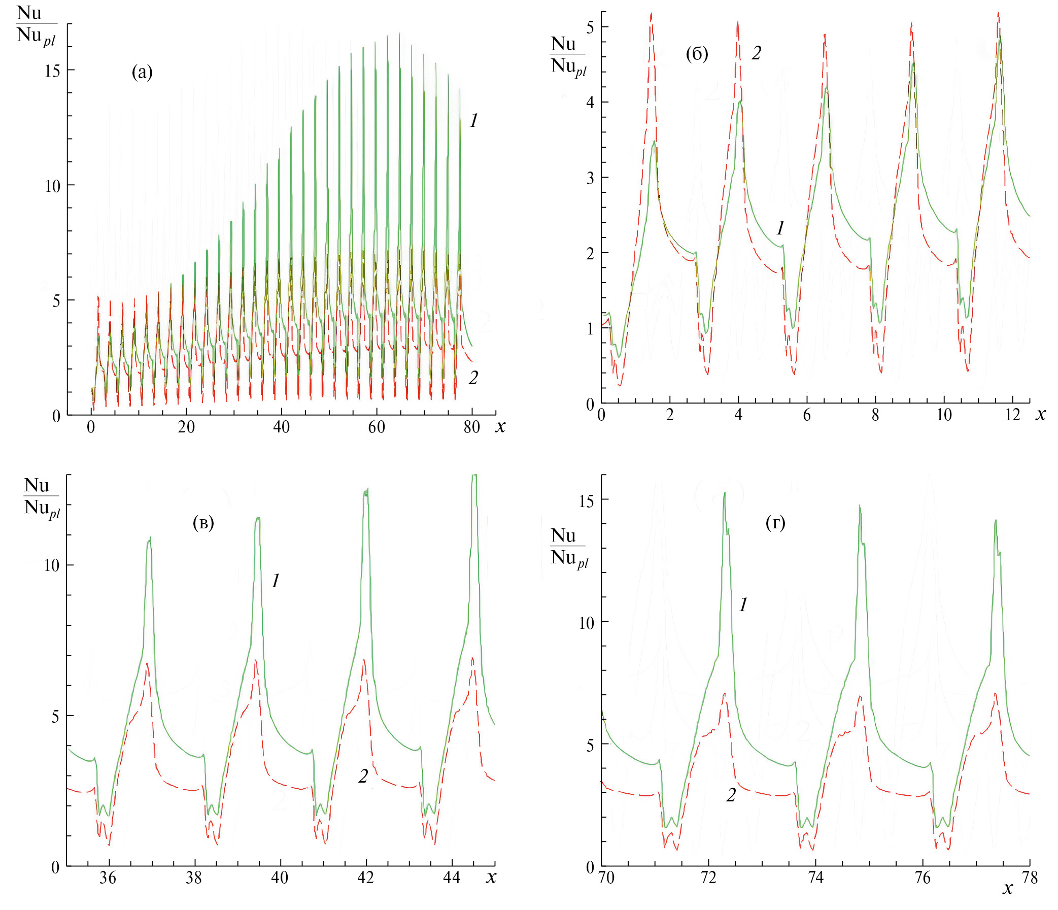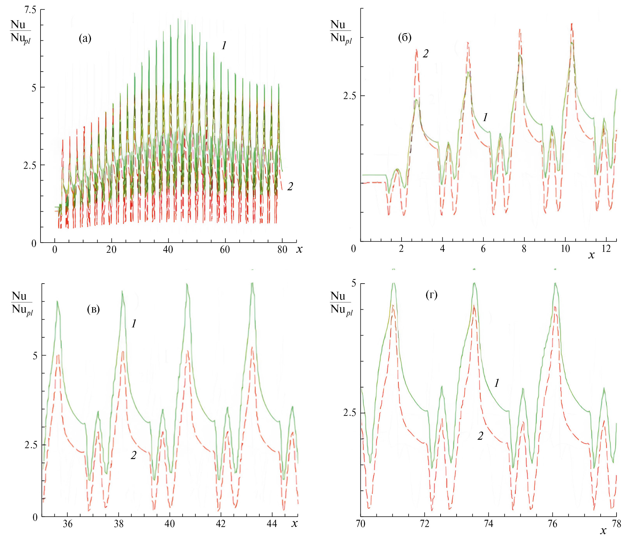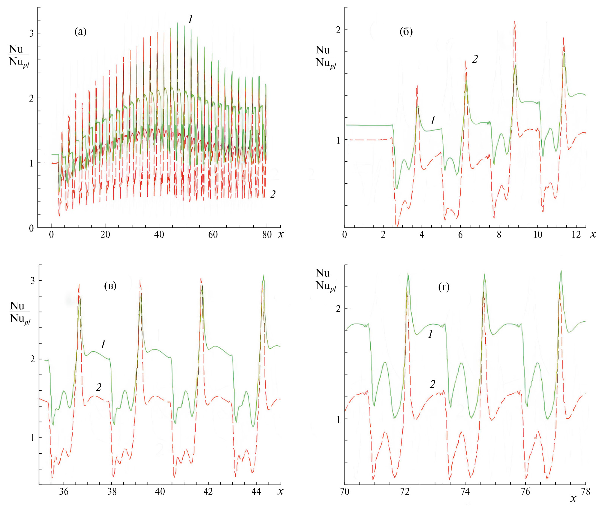На последнем участке канала наблюдается тенденция к стабилизации характеристик при некотором снижении разброса амплитуд колебаний. Для детального анализа фаз развития, достижения наибольших экстремумов и приближения к стабилизации течения в канале представляются укрупненные фрагменты f/fpl(x) в районе первой, двадцатой и тридцатой канавок (рис. 2б–г). С этой целью на этих и последующих рисунках рассматриваются входной (протяженностью от 0 до 12.5), средний (от 35 до 45 для относительного трения и перепада давления и от 46 до 56 для относительной осредненной теплоотдачи) и выходной участок (от 70 до 78).