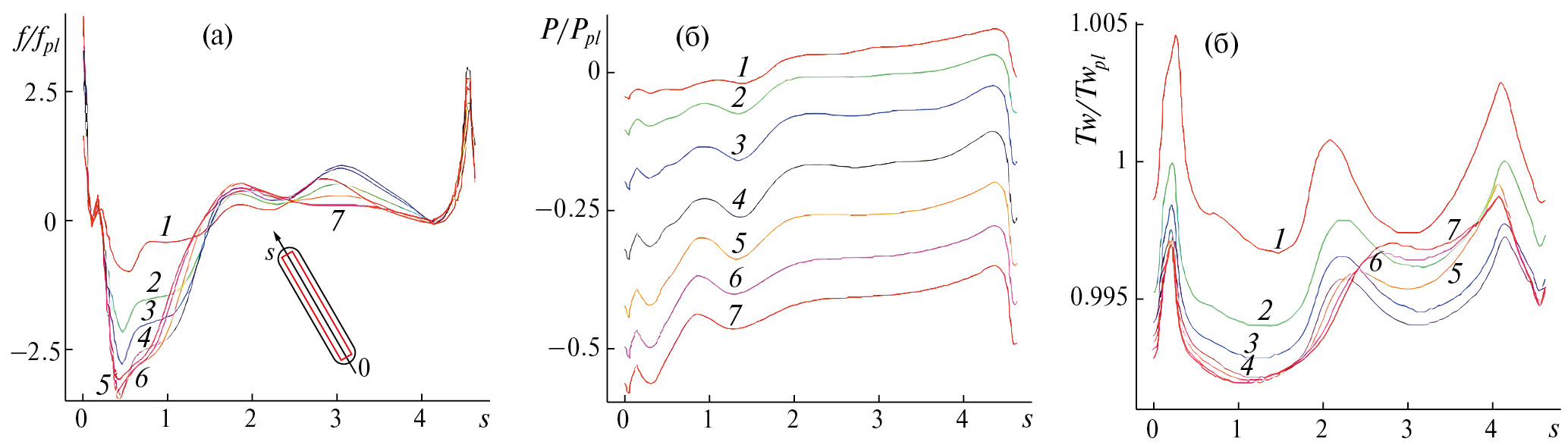 Рис. 11. Сопоставление распределений локальных относительных чисел Нуссельта Nu/Nupl(s) в срединных сечениях канавок (а, б) и проинтегрированных по поперечным и продольным полосам Num/Numpl вдоль продольной s (в, г) и поперечной t (д, е) координат выбранных канавок при граничных условиях q = const (а, в, д) и T = const (б, г, е): 1 – 1-я; 2 – 5-я; 3 – 10-я; 4 – 15-я; 5 – 20-я; 6 – 25-я; 7 – 30-я.
