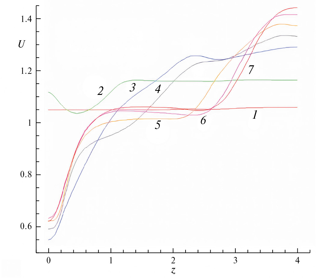 Рис. 13. Трансформация профилей продольной составляющей скорости U(z) в продольных сечениях канала, соответствующих центрам выбранных канавок, при у = 0.5: 1 – 1-я; 2 – 5-я; 3 – 10-я; 4 – 15-я; 5 – 20-я; 6 – 25-я; 7 – 30-я.