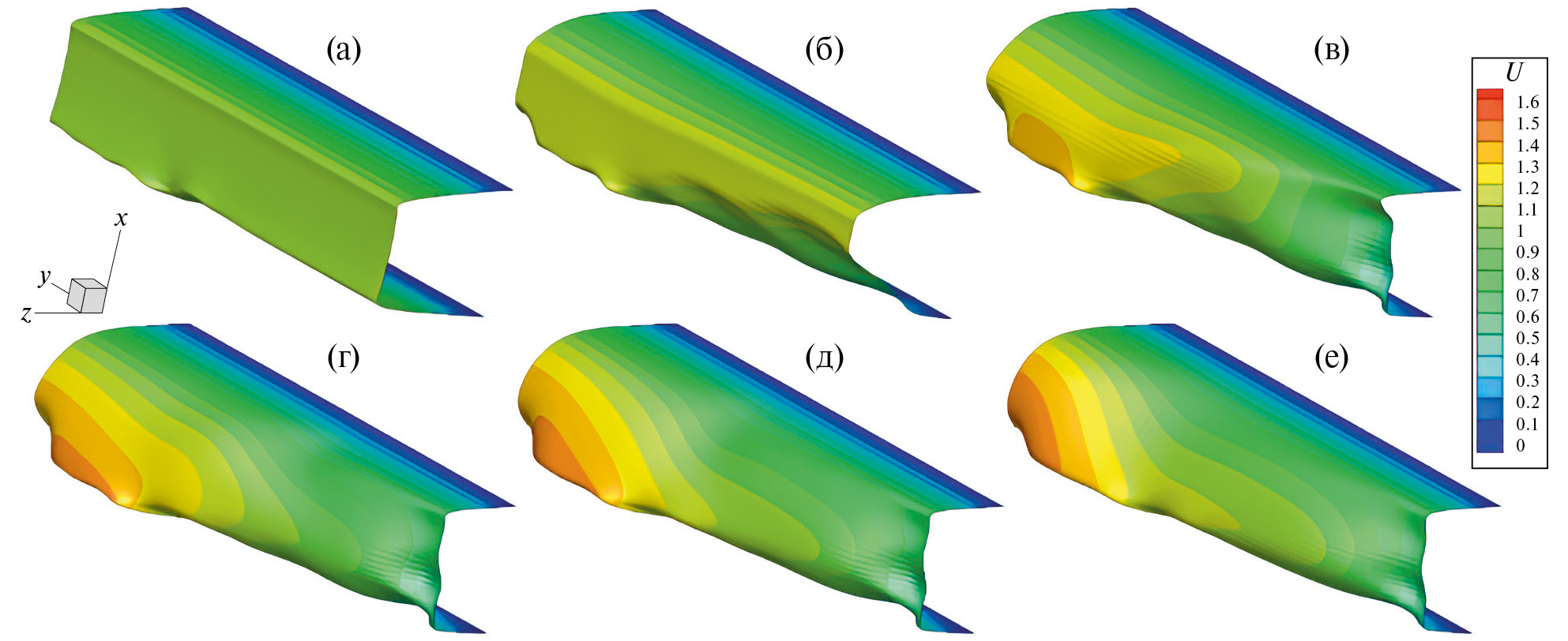 Рис. 14. Эволюция профилей продольной составляющей скорости U(z, у) в продольных сечениях канала, соответствующих центрам выбранных канавок 1-й (а), 5-й (б), 10-й (в), 15-й (г), 20-й (д) и 30-й (е).