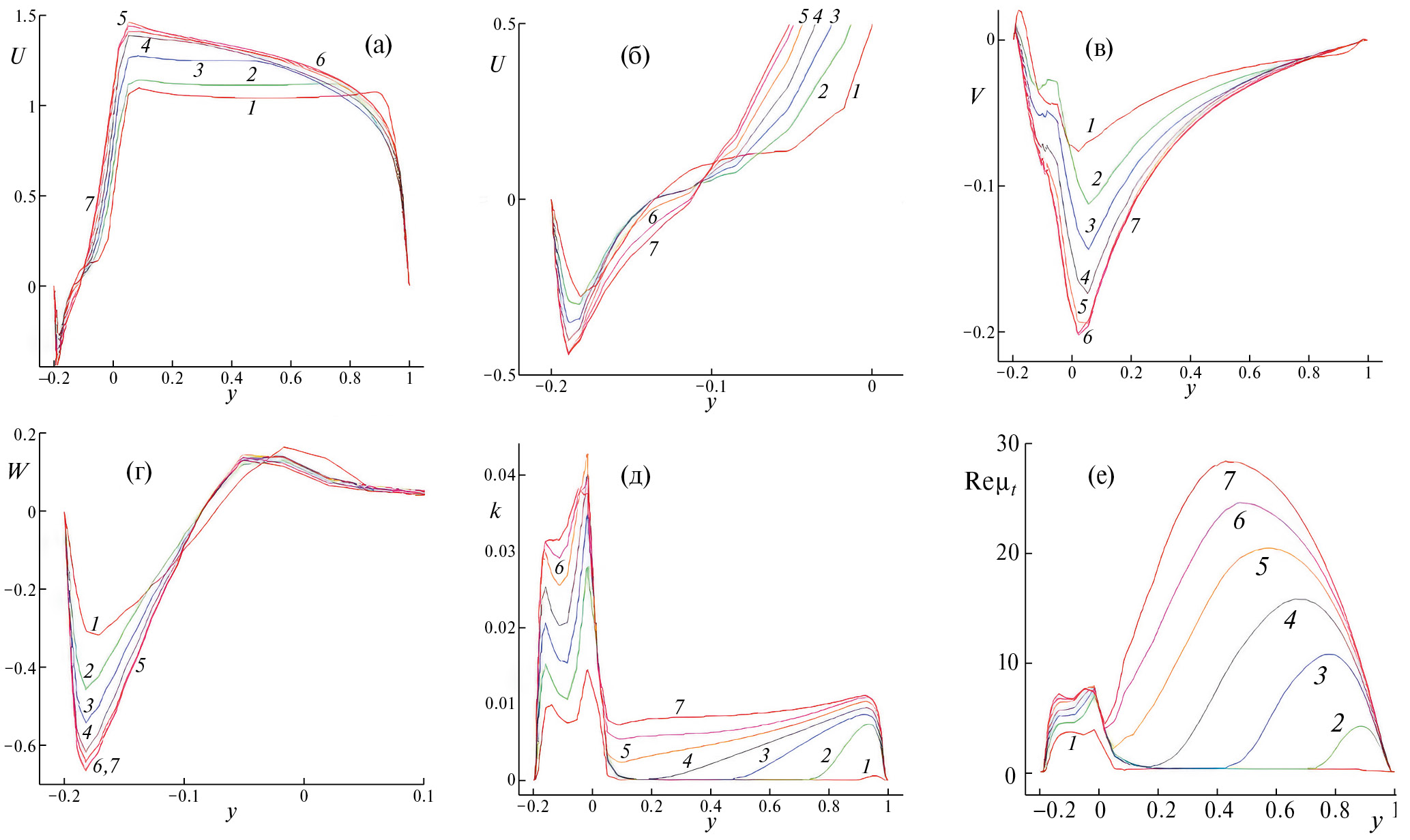 Рис. 15. Сравнение зависимостей от вертикальной координаты у декартовых составляющих скорости U (а, б), V (в), W (г), k (д), Reµt (е) в центрах сечений перехода от входных сферических сегментов к траншейных вставках выбранных канавок: 1 – 1-й; 2 – 5-й; 3 – 10-й; 4 – 15-й; 5 – 20-й; 6 – 25-й; 7 – 30-й. Графики на рис. 12б построены в крупном масштабе.