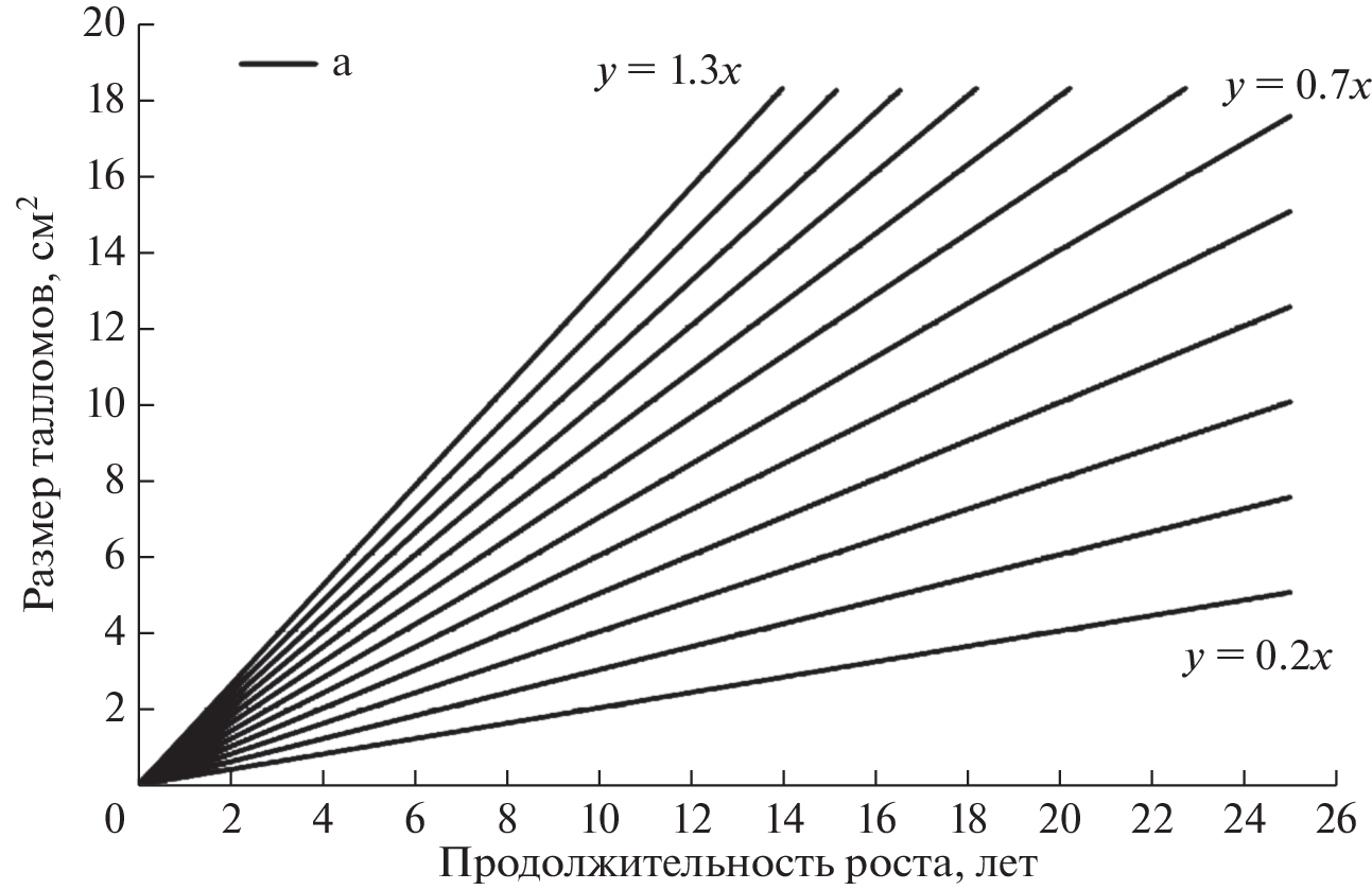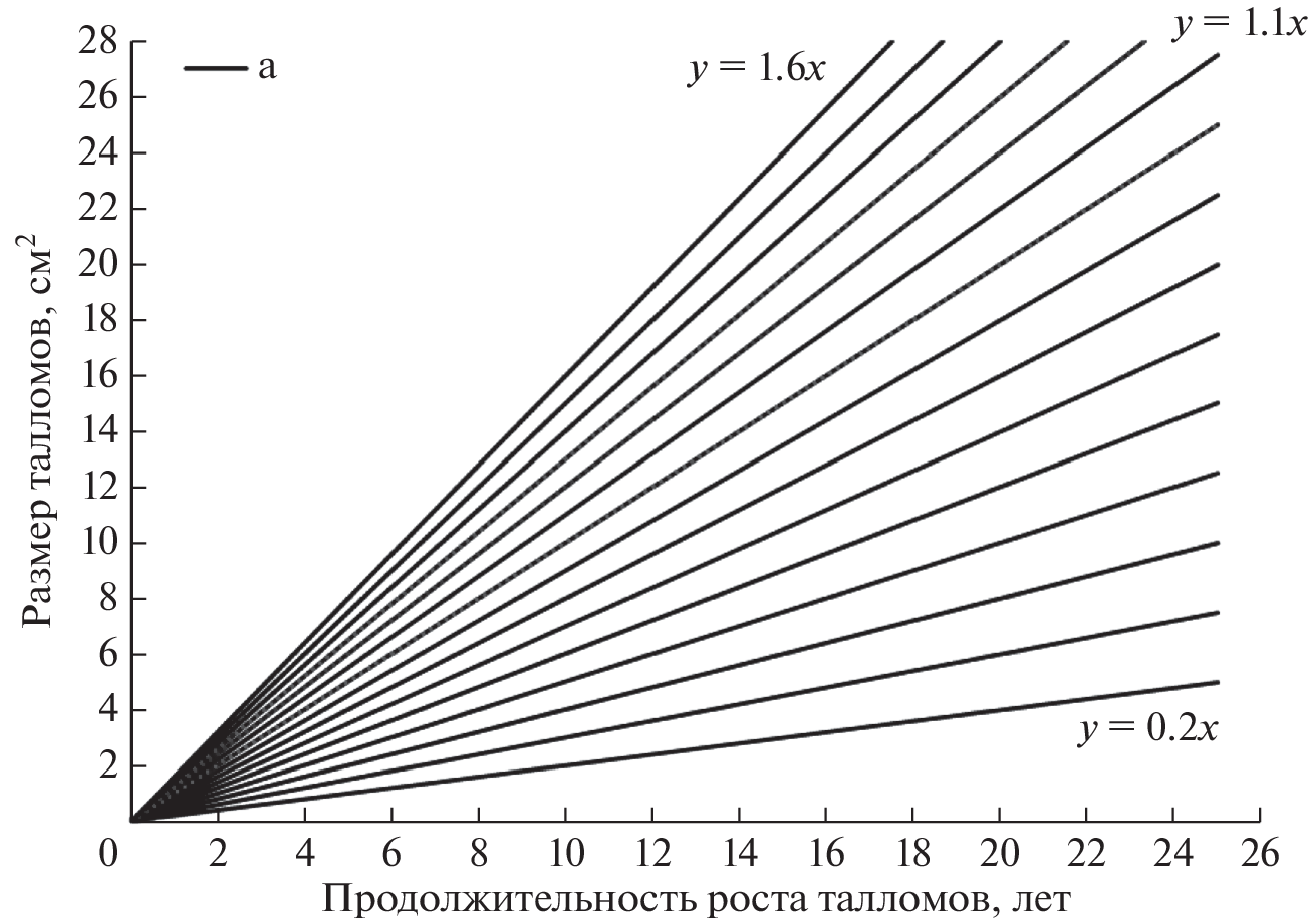 On the territory of the Kivach State Nature Reserve (North-West Russia, the Republic of Karelia) in the supralittoral conditions of the Suna River coast, the growth characteristics of 3 epilithic lichen species – Bellemerea alpina, Lecidea lapicida, Protoparmeliopsis muralis – were studied. Data were analyzed over an 11‑year follow-up period. For each studied thallus, a growth model was created using regression analysis, which reflects the dependence of the area of the thallus on the year of measurement and makes it possible to estimate the age of the thalli. Data were obtained on the size (cm2), growth rate (cm2/year), and age (years) of thalli. For these signs, the confidence interval of the means and the confidence interval of possible values were estimated at a probability of P = 95%.
