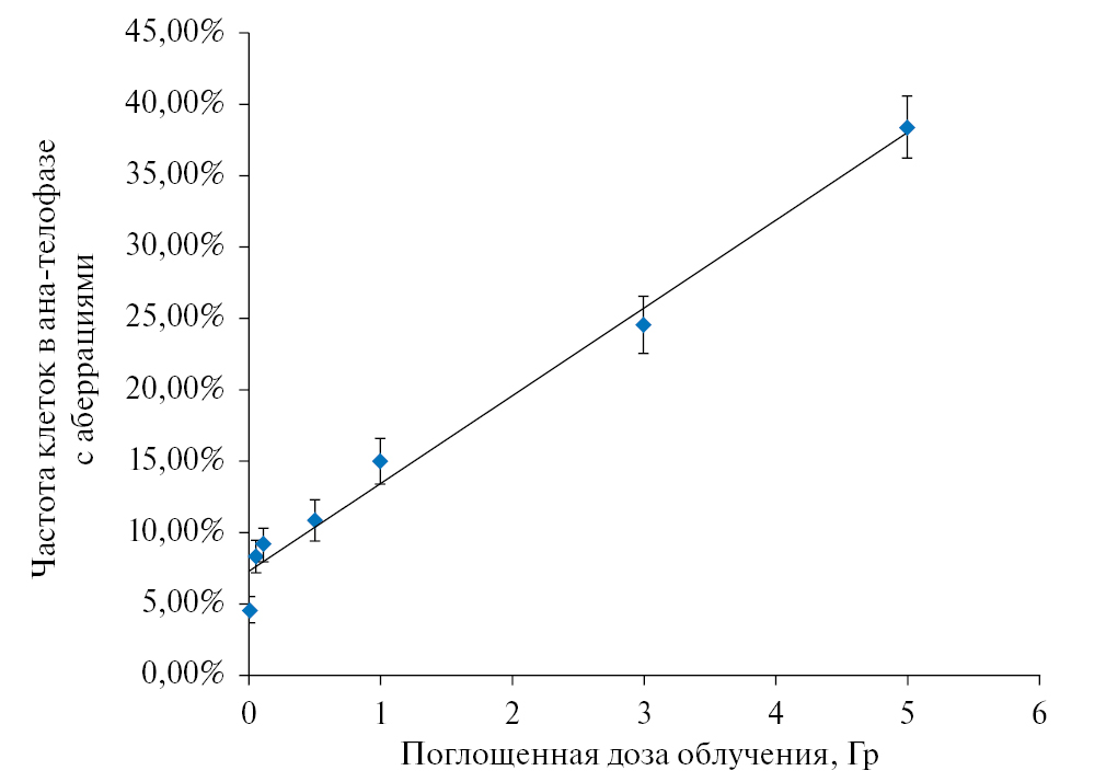 Статистически значимое повышение частоты клеток с аберрациями было обнаружено при радиационном воздействии в дозе 0.05 Гр и выше. В диапазоне доз до 5 Гр частота клеток с хромосомными аберрациями линейно зависит от дозы гамма-облучения (R2 = 98.40; F = 309.90; p < 0.001).