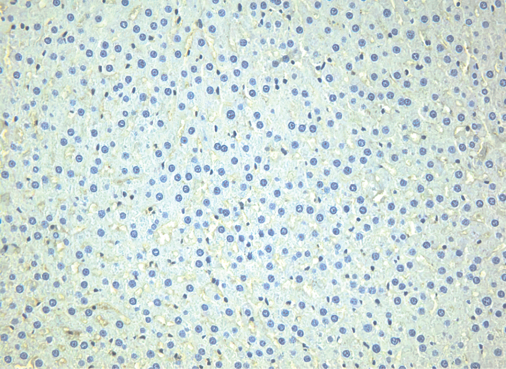 Рис. 1. Фрагмент печени крыс контрольной группы. TNFRSF12A+ клетки в паренхиме печени отсутствуют. Иммуногистохимическое выявление TNFRSF12A+ клеток и докрашивание гематоксилином Майера. Увел. об. 40×