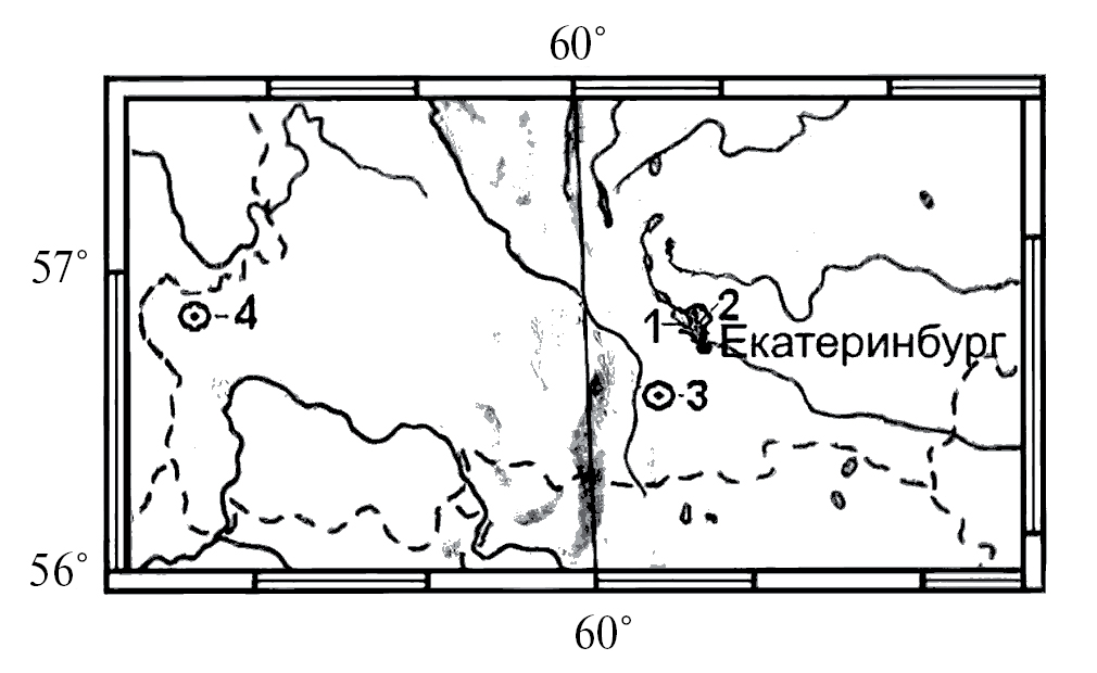 Рис. 1. Карта-схема сбора материала: 1 – селитебная часть города Екатеринбурга; 2 – лесопарковая часть города Екатеринбурга; 3 – с. Мраморское; 4 – д. Большое Кошаево