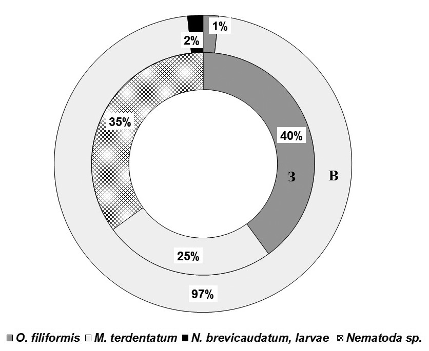 Личинка нематоды N. brevicaudatum отмечена у животных в природных популяциях, доля составляет 1.67% (табл. 2, рис. 3).