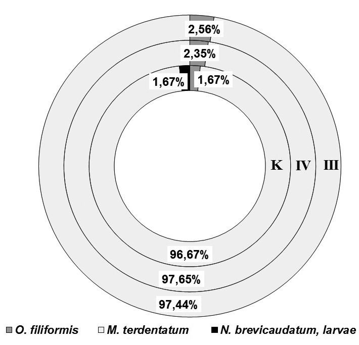 На территории урбоценоза и на природных территориях восточного склона доминирует M. terdentatum, ее доля в градиенте урбанизации держится на высоком уровне (от 96.67% у амфибий загородных территорий до 97.44% у животных селитебной зоны). Доля O. filiformis низка и в градиенте урбанизации увеличивается (от 1.67% на загородной территории до 2.56% на селитебной) (рис. 3).
