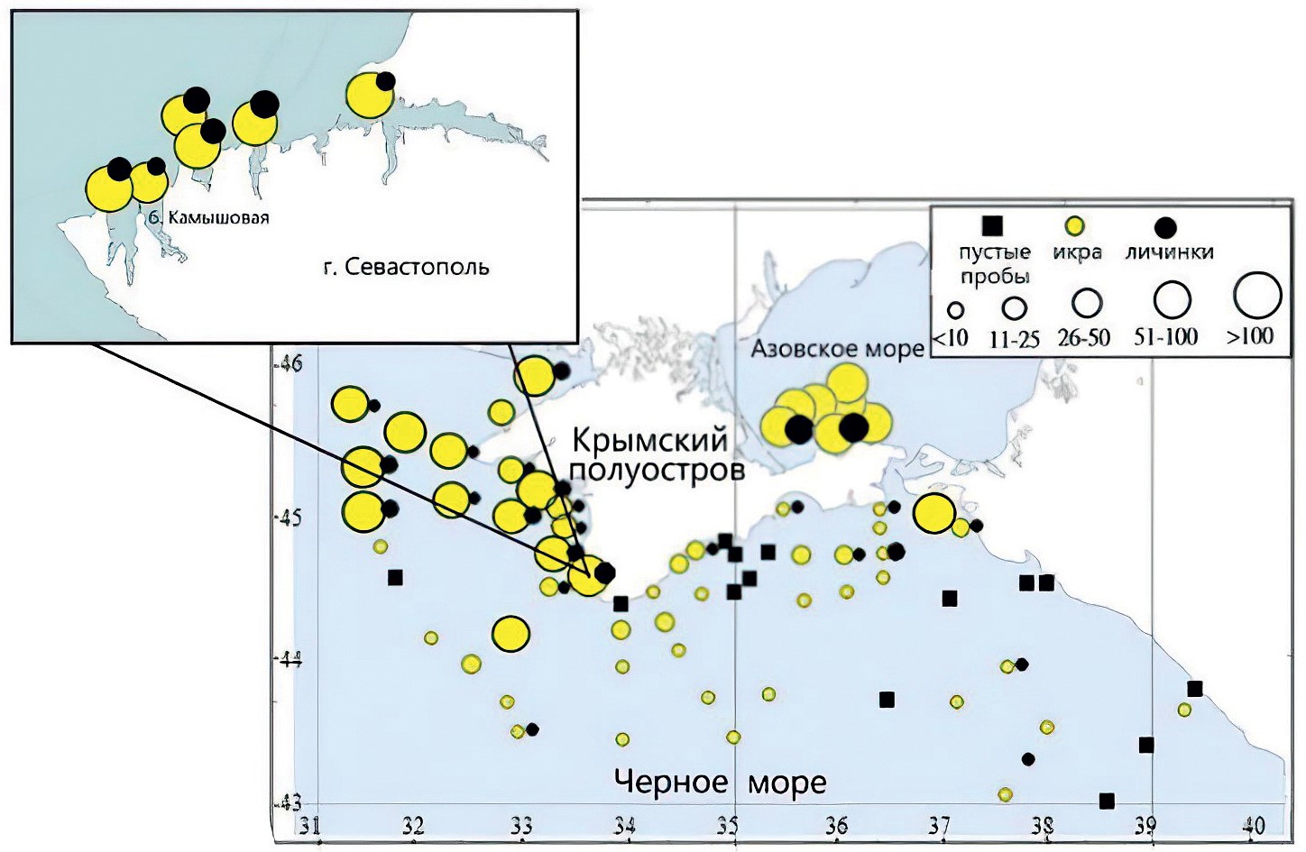 Наиболее благоприятные условия для выживания ихтиопланктона наблюдались в прибрежной акватории Севастополя, где отмечены максимальная численность икры и личинок рыб и высокие показатели индексов видового разнообразия. К концу третьей декады июня эффективность нереста массового промыслового вида E. encrasicolus была сопоставима с июлем – августом середины ХХ века и составляла свыше 34%.