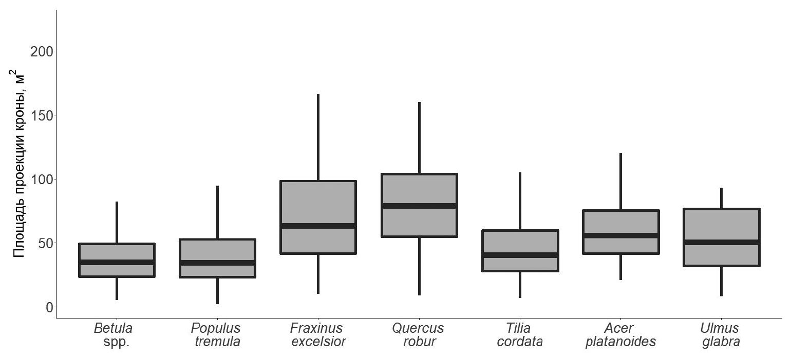 Рис 1. Площади проекций крон деревьев первого яруса разных видов по архивным данным (перечет 1986–1988 гг.). Нижняя граница бокса – 1-й квартиль, верхняя – 3-й; толстой горизонтальной линией обозначен 2-й квартиль (медианное значение); “усы” показывают размах значений
