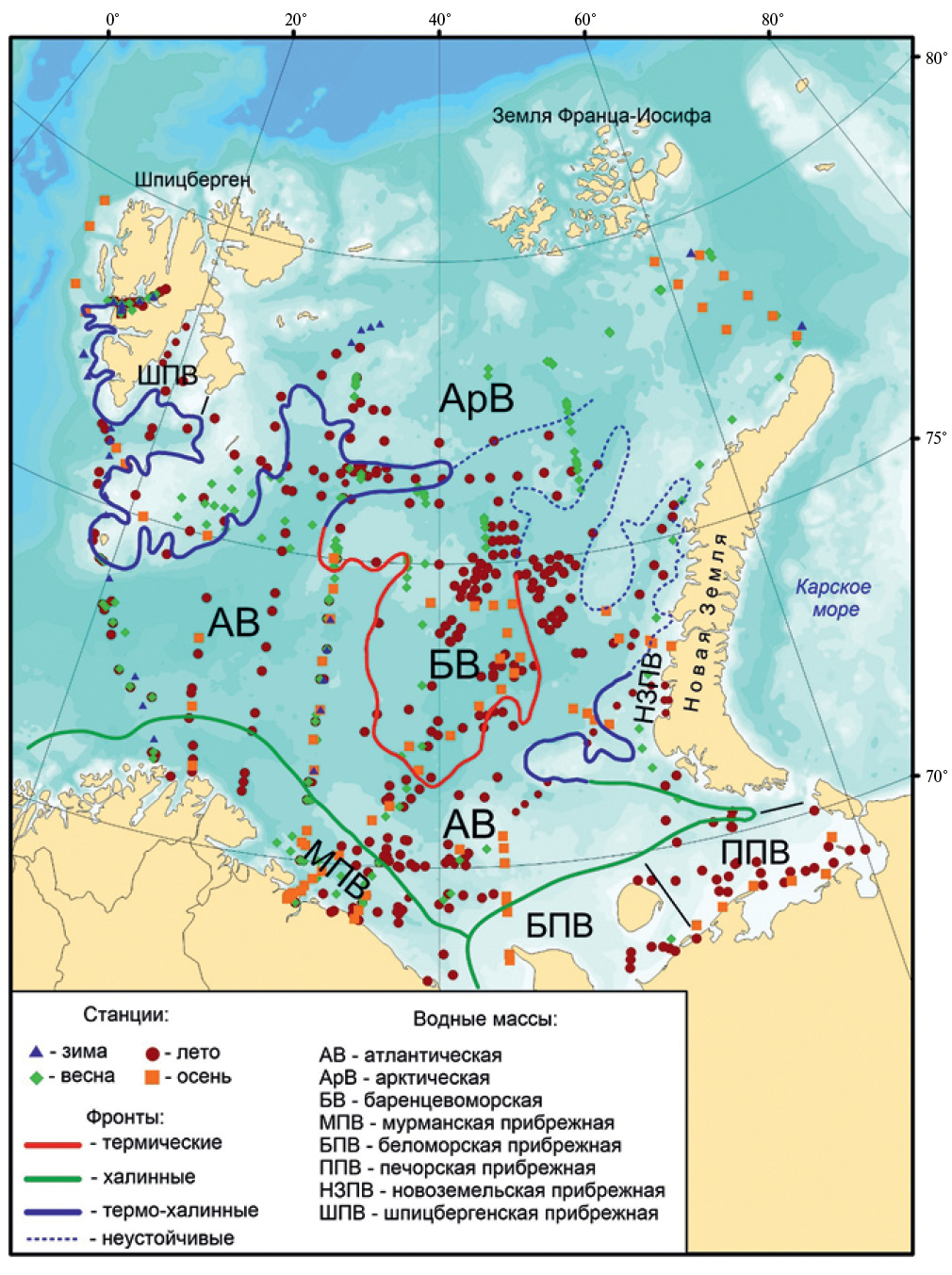 Примечание. Водные массы: АрВ – арктическая, АВ – атлантическая, БВ – баренцевоморская, МПВ – мурманская прибрежная, НЗВП – новоземельская прибрежная, ППВ – печорская прибрежная, ШПВ – шпицбергенская прибрежная, БПВ – беломорская прибрежная.
