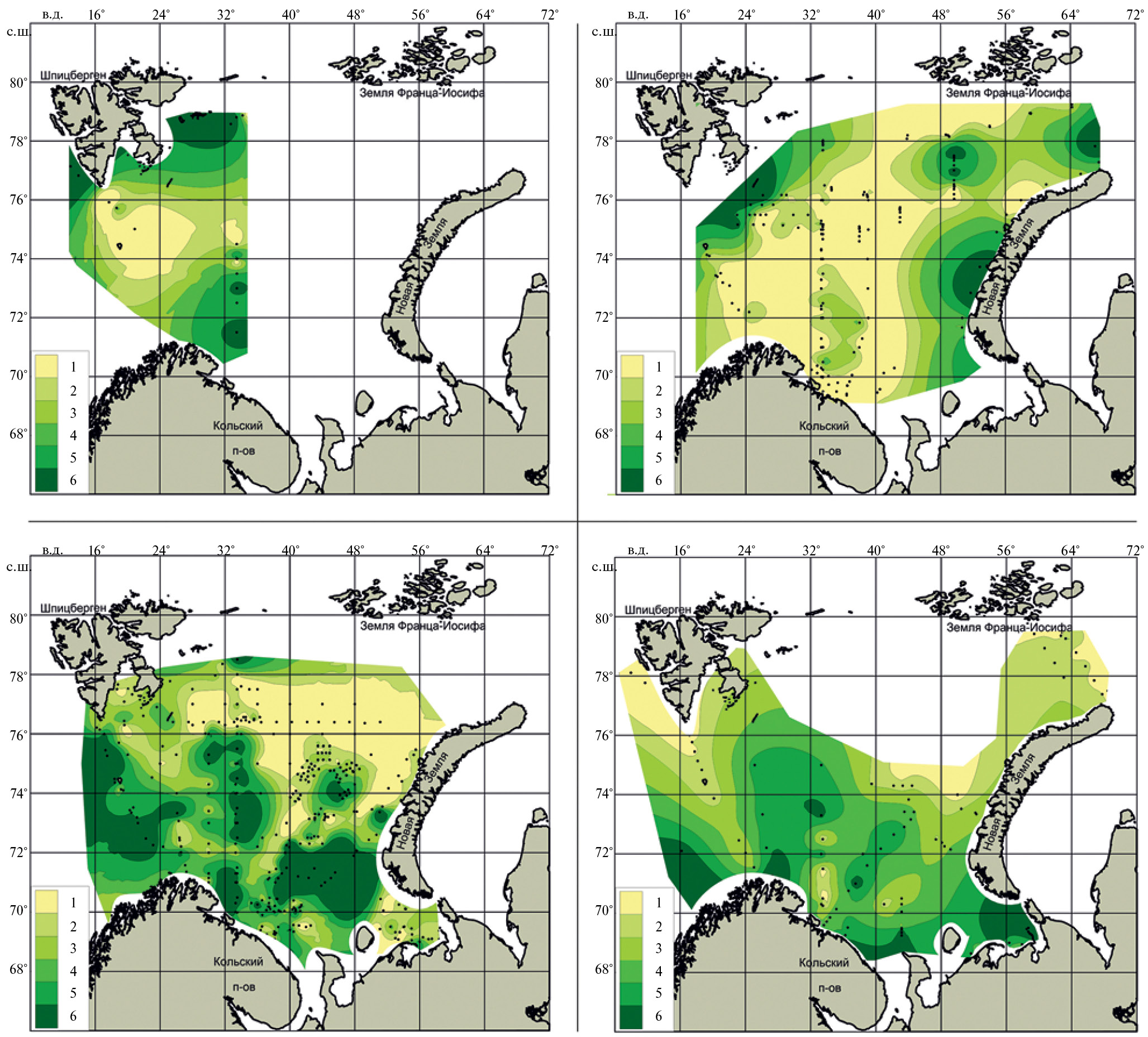 Рис. 2. Сезонное распределение усредненных концентраций хлорофилла а (мг/м3) в поверхностном слое Баренцева моря в 1984–2020 гг. (а) зима: 1 – < 0.05, 2–0.05–0.10, 3–0.11–0.12, 4–0.13–0.15, 5–0.16–0.18, 6 – > 0.18. (б) весна: 1 – < 0.1, 2–0.1–0.5, 3–0.6–0.9, 4–1.0–1.3, 5–1.4–2.2, 6 – > 2.2. (в) лето: 1 – < 0.10, 2–0.10–0.25, 3–0.26–0.39, 4–0.40–0.54, 5–0.55–0.80, 6 – > 0.80. (г) осень: 1 – < 0.08, 2–0.09–0.23, 3–0.24–0.32, 4–0.33–0.50, 5–0.51–0.75, 6 – > 0.75.