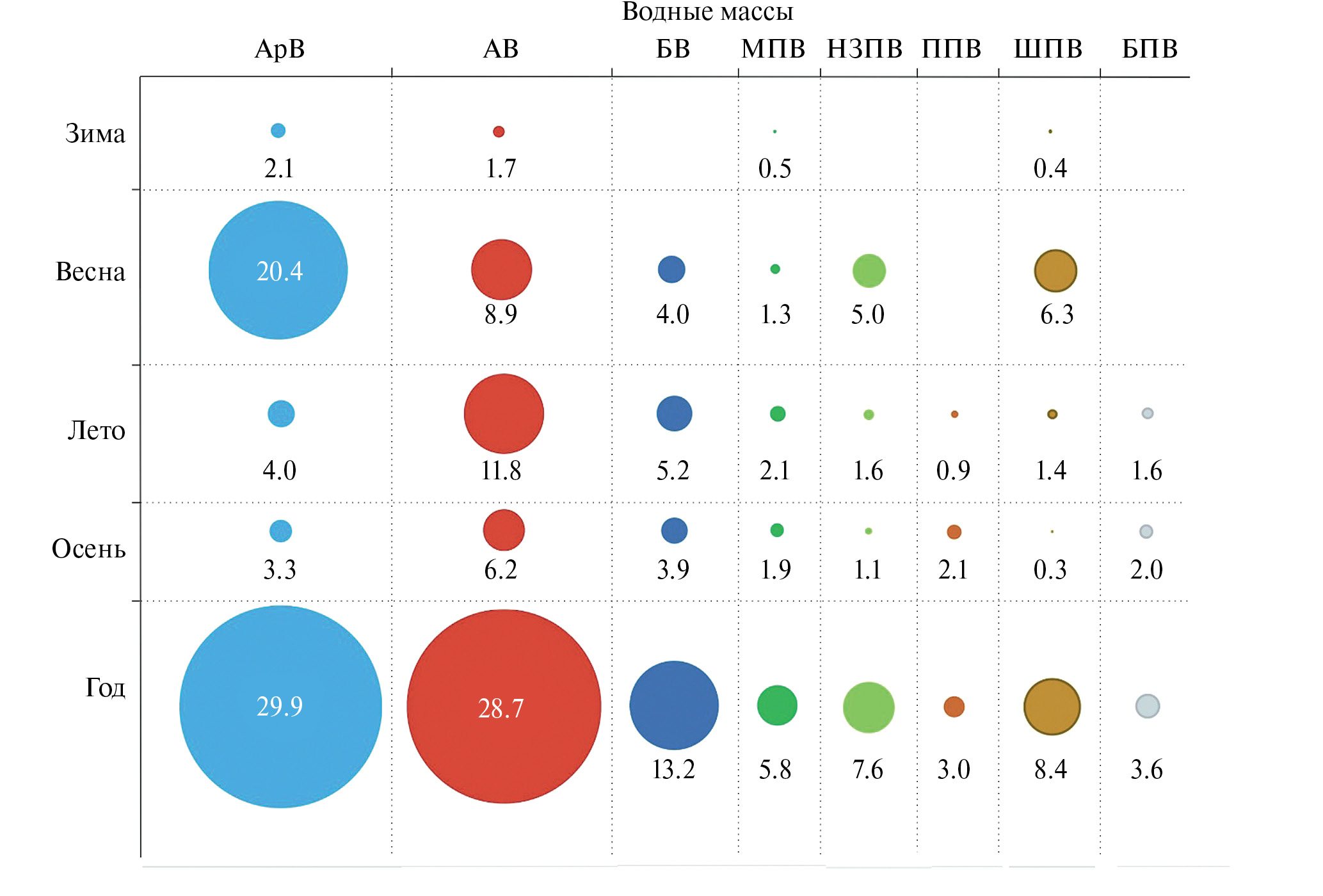 Водная масса | Сезон | ||||