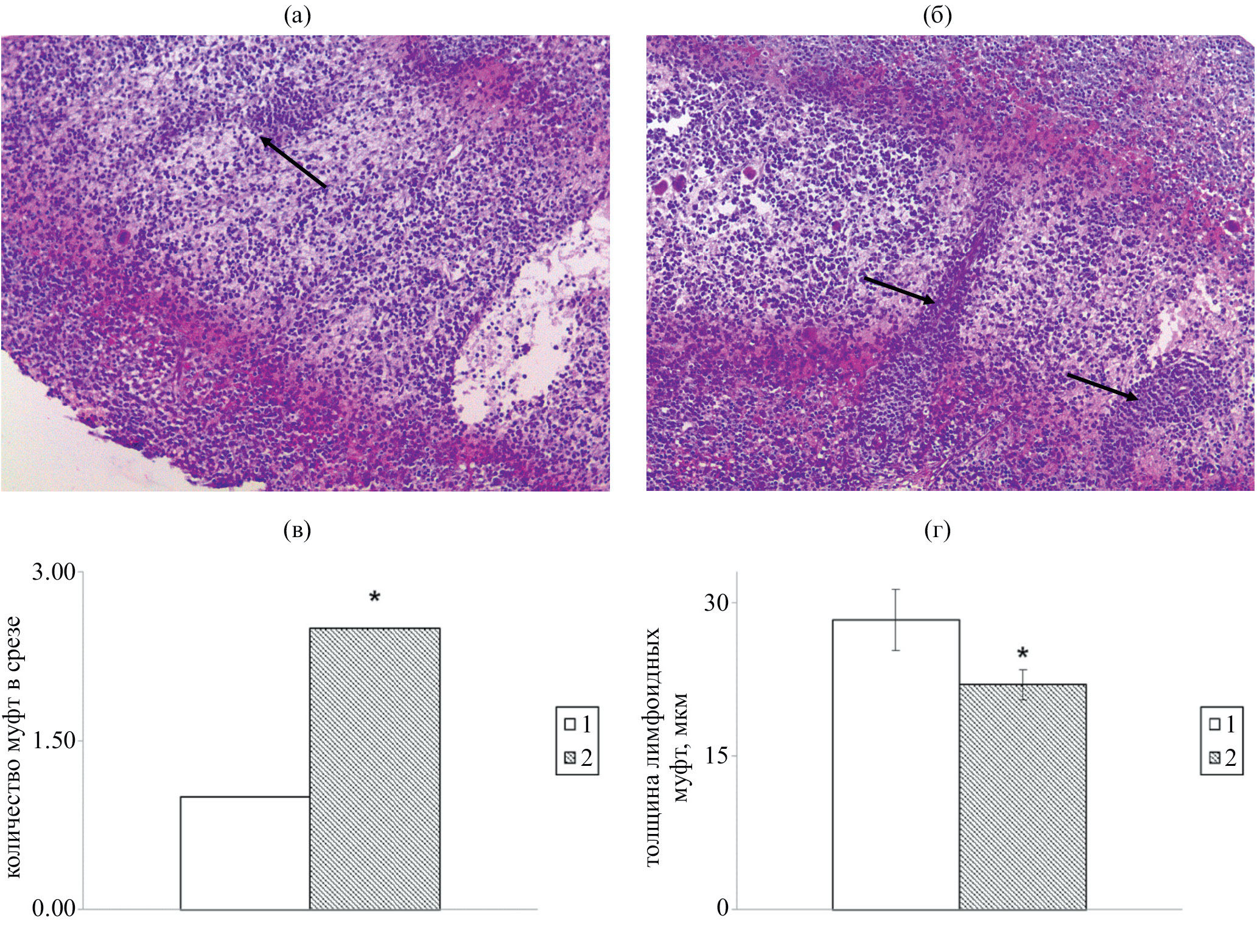 Рис. 2. Характеристика белой пульпы у новорожденных крыс контрольной группы и развивавшихся под воздействием низких доз ДДТ: а — структура селезенки новорожденной крысы контрольной группы; б — структура селезенки крысы, подвергавшейся пре- и постнатальному воздействию низких доз ДДТ. Стрелками указаны формирующиеся ПАЛМ. Окраска гематоксилином и эозином. Ув. 100; в — количество лимфоидных муфт в срезе селезенки (M ± m); г — толщина лимфоидных муфт (M ± m). * — от значений контрольной группы (р < 0.01)
