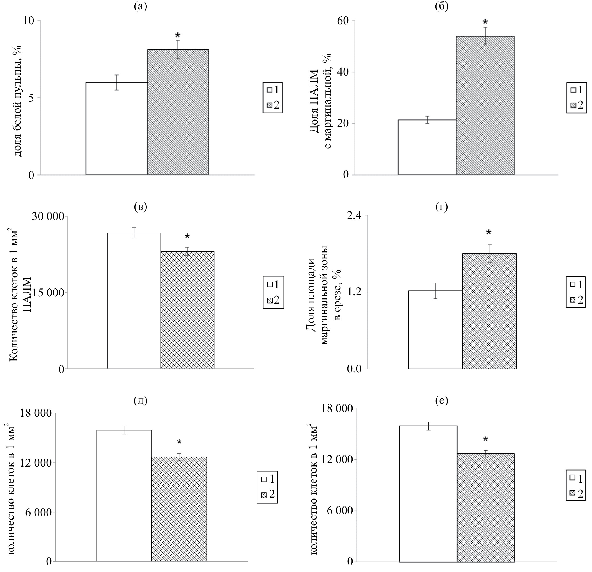 Рис. 3. Характеристика белой пульпы у 7-дневных крыс контрольной группы и развивавшихся под воздействием низких доз ДДТ (M ± m): а — доля белой пульпы в селезенке; б — доля ПАЛМ с маргинальной зоной; в — количество клеток в 1 мм2 ПАЛМ; г — доля площади маргинальной зоны в срезе селезенки; д — количество клеток в 1 мм2 маргинальной зоны; е — количество нейтрофилов в 1 мм2 маргинальной зоны. * — от значений контрольной группы (р < 0.01)