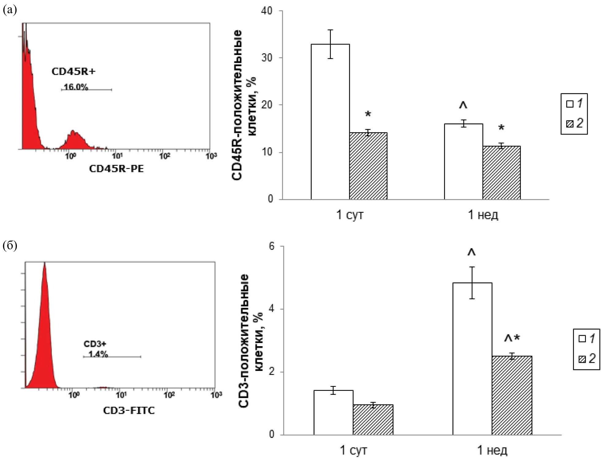 Получали суспензию клеток селезенки. Клетки селезенки выделяли путем гомогенизации селезенки в среде RPMI 1640 («ПанЭко», Россия) с продавливанием через сетки с отверстиями 40 мкм для отделения от стромы. Клеточную взвесь дважды отмывали в той же среде центрифугированием 1000 х g, 5 мин. Доводили взвесь до концентрации 10 млн клеток в 1 мл. Проводили цитофлуориметрическое исследование клеток селезенки с использованием антител к антигенам CD45R, CD3, СD4, CD8, конъюгированных с флуорохромами (eBioscience, США) для определения содержания В-лимфоцитов и субпопуляций Т-клеток. Исследовали не менее 100000 клеток в каждом образце. Процедуру подготовки для цитофлуориметрического исследования проводили по стандартным протоколам. Для исследования использовали проточный цитометр FC500 (Beckman Coulter, Германия).