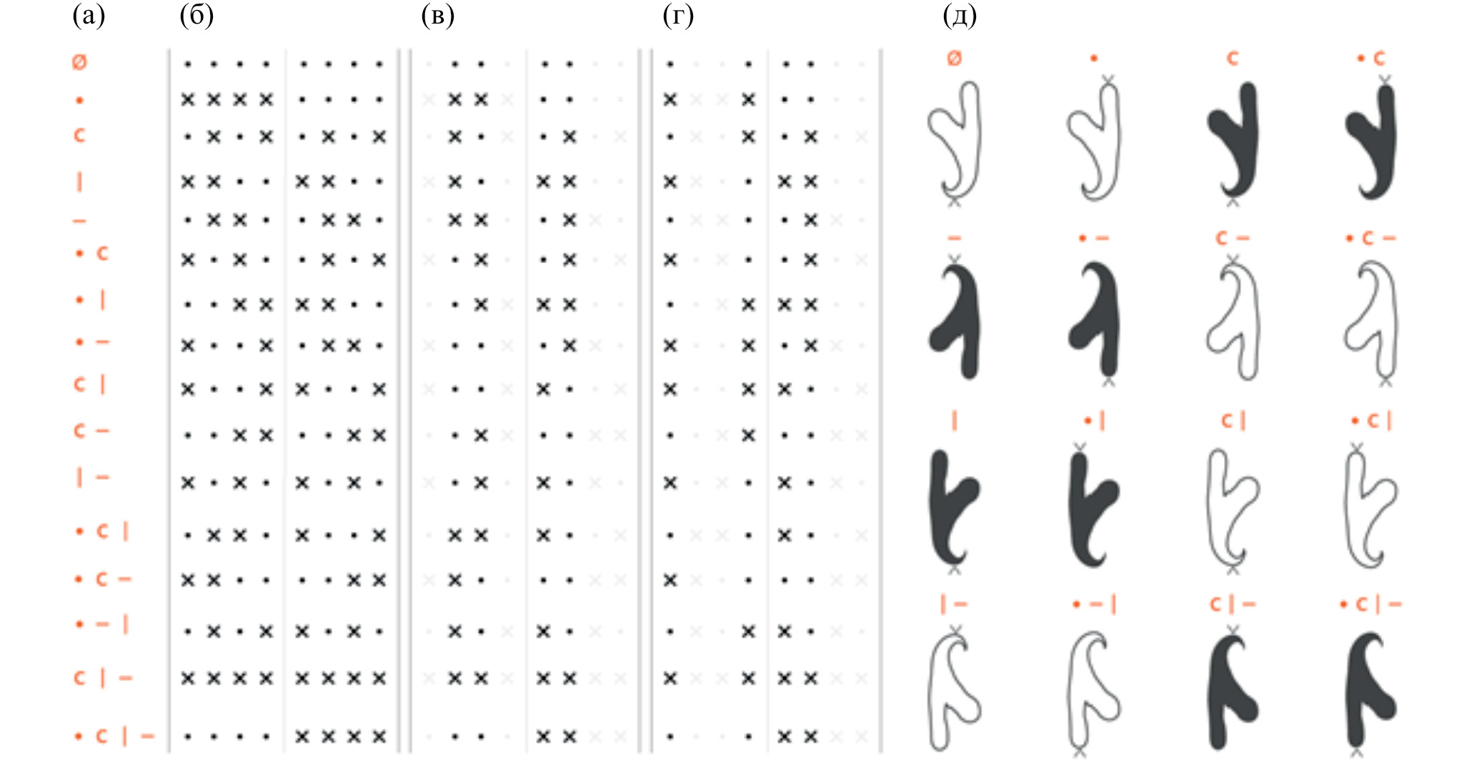 Рис. 4. Правила замены знаков и действие операторов согласования: а – Ø – нулевой оператор, не влияющий на контур, • – оператор сдвига начальной точки контура в противоположную часть, ϲ – оператор инверсии направления обхода, ― и | – операторы зеркального отражения относительно горизонтальной и вертикальной осей; б – правила замены знаков коэффициентов; правило записано для первых двух гармоник (восьми коэффициентов), но его следует применить для каждой пары гармоник, начиная с первой; в записи использованы следующие обозначения: × – инверсия знака, ∙ – знак остается прежним; в, г – маски для поиска операторов, соответствующих знаковой разности согласуемых контуров, при вертикальном (в) и горизонтальном (г) выравнивании контуров; д – результат действия операторов на контуры.