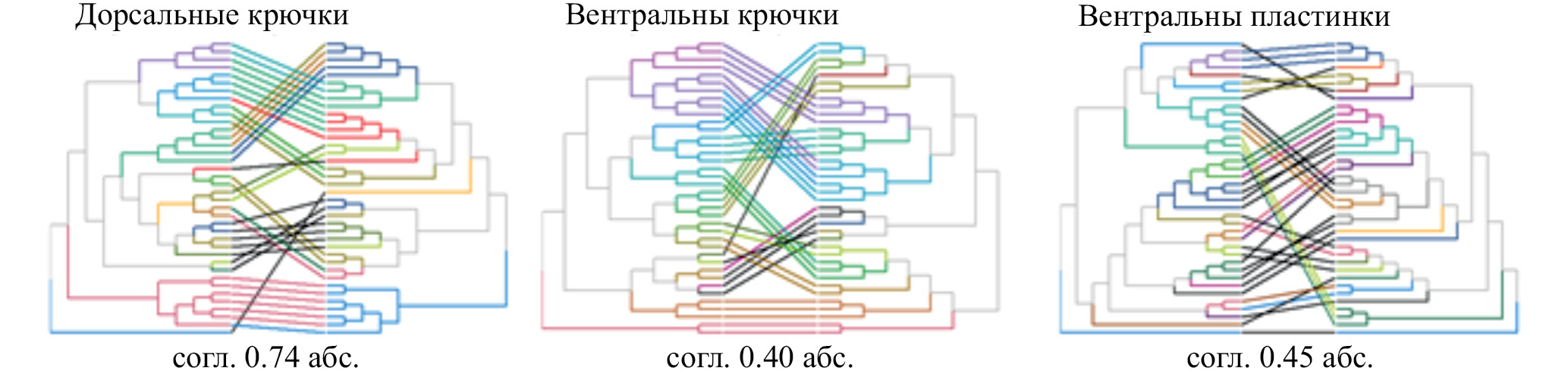 Cравнение дендрограмм, построенных по абсолютным и согласованным значениям коэффициентов, показало, что они отличаются друг от друга. Наибольшее сходство было между дендрограммами, построенным для дорсальных крючков (γda = 0.74), а сходство между двумя другими разновидностями дендрограмм было средним: у вентральных крючков γva = 0.40, у вентральных пластинок γvb = 0.45 (рис. 7). Очевидно, что результаты кластеризаций согласованных и абсолютных значений коэффициентов не могут быть идентичными, так как среди согласованных коэффициентов встречаются отрицательные значения, отсутствующие у абсолютных значений. Следовательно, абсолютные значения коэффициентов не могут заменить согласованные коэффициенты.