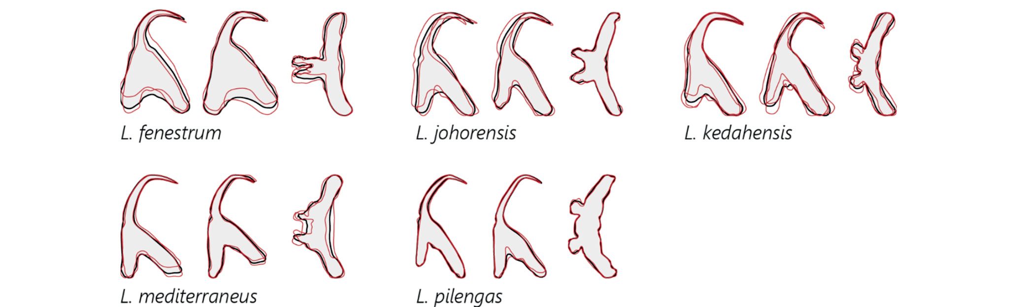 Рис. 8. Средние формы (черные) прикрепительных структур представителей пяти видов рода Ligophorus (темно-красные), построенные при помощи осреднения значений согласованных коэффициентов ЭПФ.