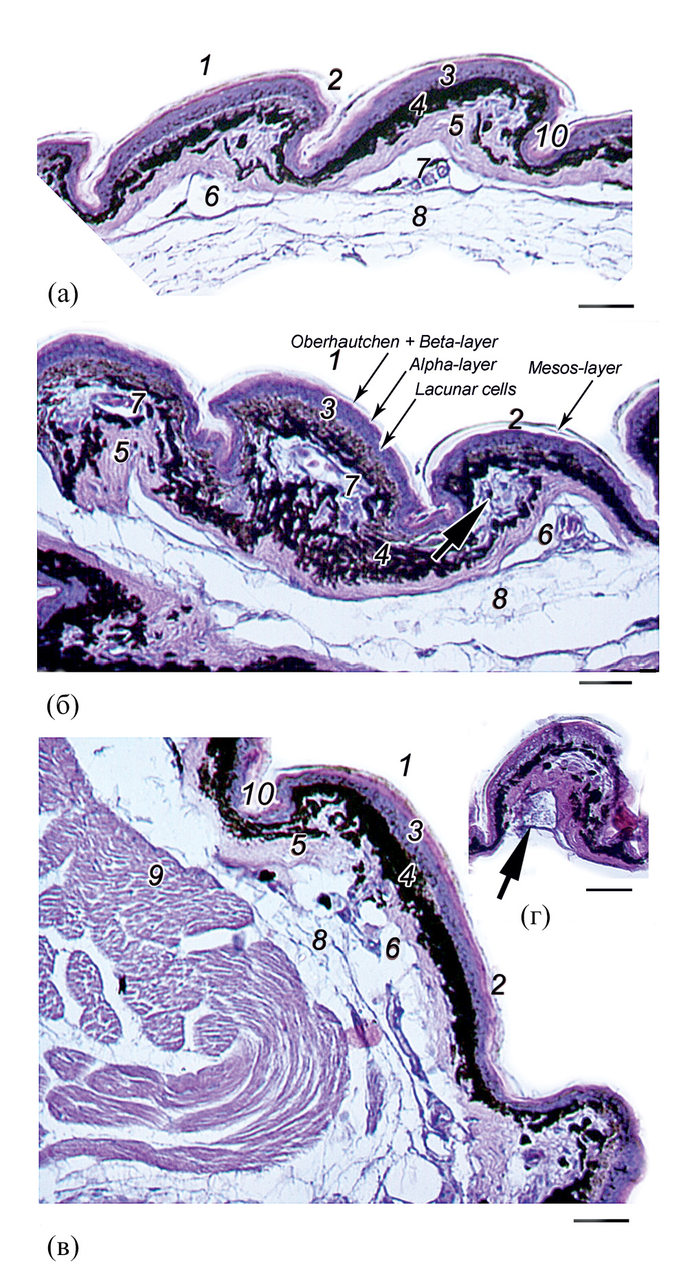 Рис. 2. Микроструктура бугорчатых дорсальных чешуй у взрослых особей Darevskia armeniaca (а), D. nairensis (б) и D. dahli (в) на сагиттальных срезах: 1 – чешуйка, 2 – Oberhäutchen – надкожица и ß-слой, 3 – эпидермис, 4 – слой меланофоров, 5– дерма, 6 – лакуна подкожной клетчатки, 7 – кровеносный сосуд с эритроцитами, 8 – подкожная клетчатка, 9 – поперечнополосатая мускулатура, 10 – полость межчешуйного кармана. Стрелками обозначены остеодермы. Здесь и на рисунках 3–6 срез кожи на стадии покоя эпидермиса. Окраска гематоклисин-эозином. Микрофото. Масштаб 20 мкм.